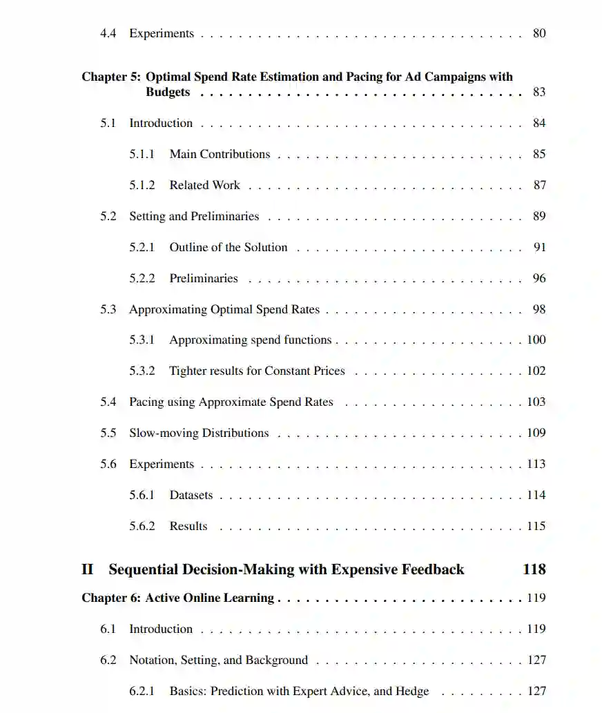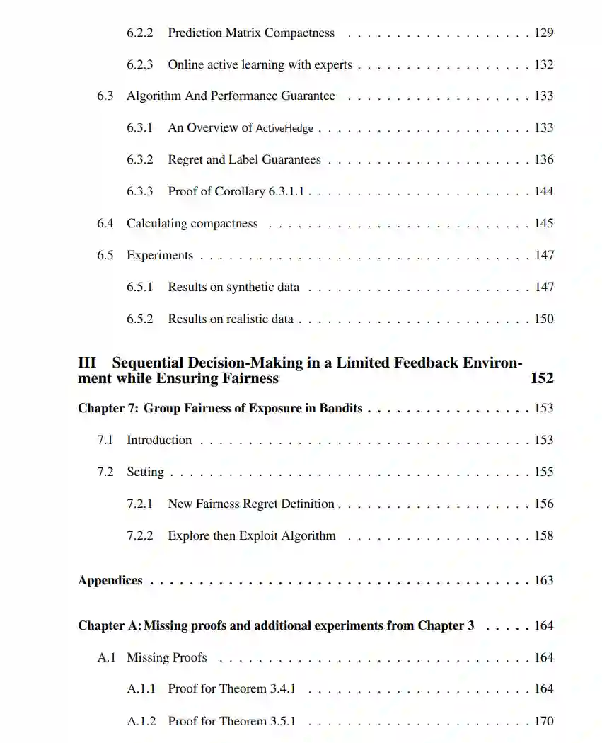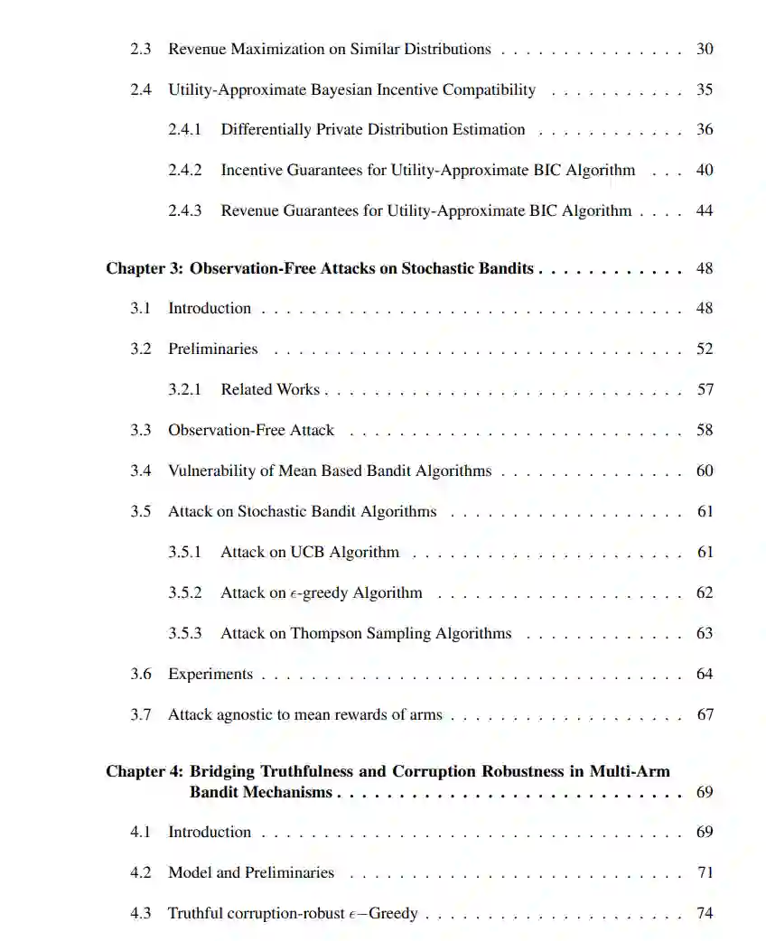 在论文的第一部分中,我们专注于重复拍卖,并设计了拍卖者可以在战略投标人存在的情况下有效学习的机制,反之,解决智能体如何在重复拍卖中投标或使用数据中毒攻击来最大化他们自己的目标。在第二部分中,我们考虑在线学习环境,其中关于学习者决策的反馈是昂贵的。本文提出一种在线学习算法,受主动学习技术的启发,可以快速前进队列中信息量更大的一小部分示例。这允许学习器获得与最优在线算法相同的性能,但仅通过查询非常小的分数的反馈。最后,在论文的第三部分,我们考虑了一个新的随机多臂匪徒学习目标,它促进了个人和群体机会的择优公平。https://smartech.gatech.edu/handle/1853/70199