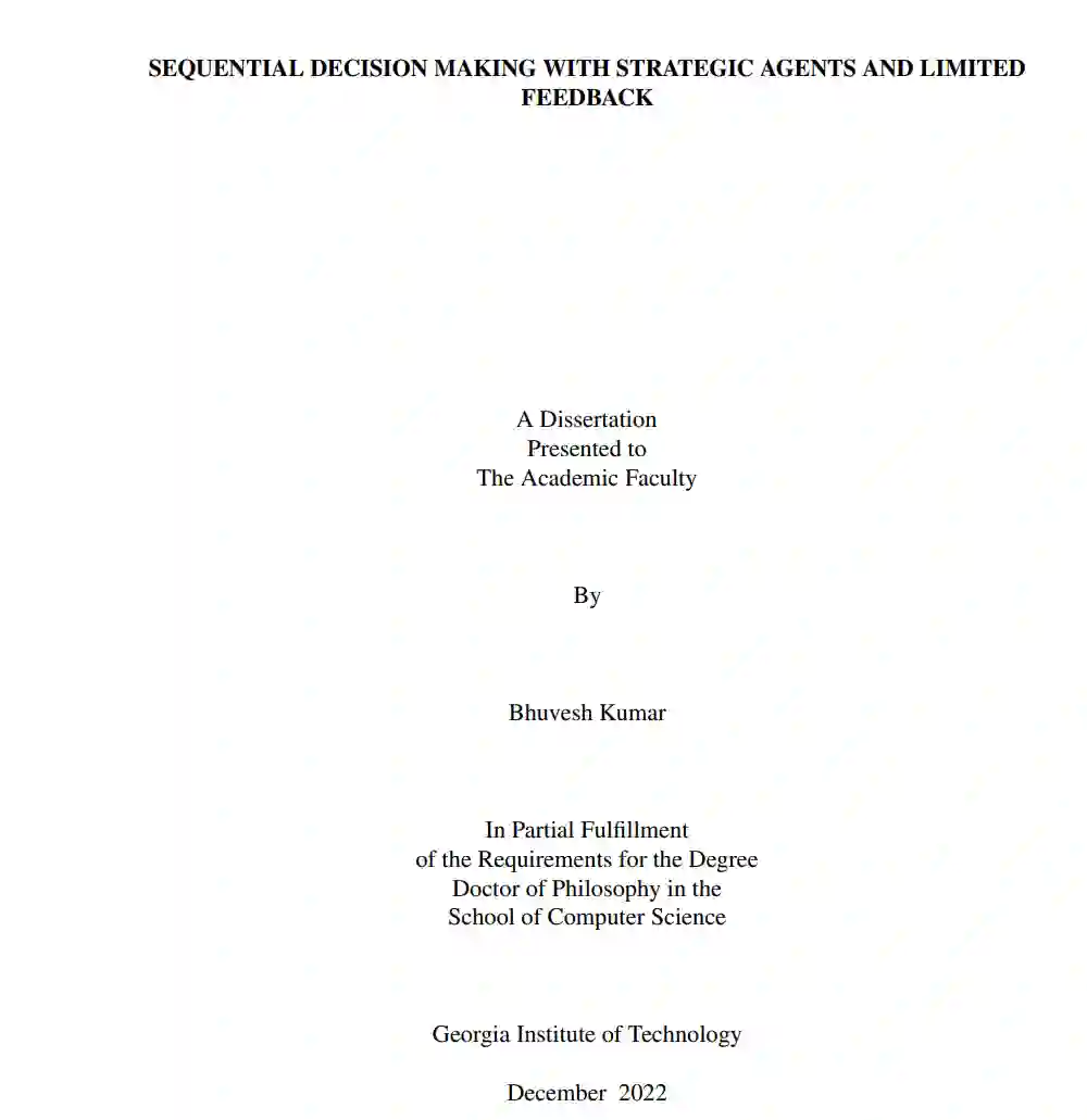 序列决策是机器学习应用的一种自然模型,学习器必须实时进行在线决策,同时从序列数据中学习,以便在未来做出更好的决策。经典工作专注于基于随机或对抗性数据分布的问题变体,或基于对学习器决策的反馈,这些决策可能是部分的或完整的。随着大型在线市场的迅速崛起,序列学习方法越来越多地部署在复杂的多智能体系统中,智能体可以根据自己的个人目标进行战略性优化。这为序列决策问题增加了一个新的维度,在这个维度中,学习器必须考虑到它正在学习的智能体的战略行为,这些智能体可能希望引导其未来的决策朝着有利于自己的方向发展。本文旨在从系统设计者的角度设计有效的在线决策算法,系统设计者的目标是在具有有限反馈的战略智能体环境中学习,以及战略智能体的目标是优化个人目标。