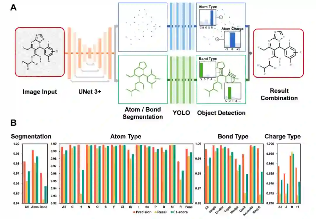 具体流程如下: 1. 数据生成器产生Markush结构图像和像素级的原子/键标签,并将其作为训练数据输入图像处理单元。其中,数据生成器对生成训练样本的数量和多样性没有严格限制,为图像处理单元和文本处理单元的泛化性提供基础。 1. **图像处理单元(图2 A)**由分割模块 (U-Net3+) 和分类模块 (YOLO)组成,将像素分割成原子、键,并定位每个原子点的几何中心,预测原子、键类型和电荷,随后融合所有得到的信息得到结构化的分子表示。 1. **文本处理单元(图3 D)**采用 BiLSTM-CRF 模型识别文本中的化学实体(R 基团和取代基)。 1. 两个分支的输出(特别是左边的原子/键标签和右边的化学实体)相互融合以重建化学信息,组合出图像及文本中涵盖的化学实体结构。