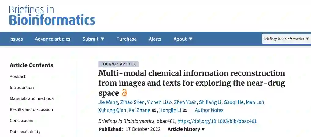 参考资料 Jie Wang, Zihao Shen, Yichen Liao, Zhen Yuan, Shiliang Li, Gaoqi He, Man Lan, Xuhong Qian, Kai Zhang, Honglin Li, Multi-modal chemical information reconstruction from images and texts for exploring the near-drug space, Briefings in Bioinformatics, 2022; bbac461 https://doi.org/10.1093/bib/bbac461