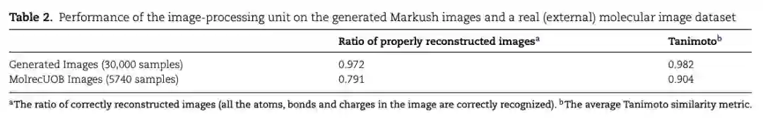 图像处理单元的性能如图2 B,表2所示。在人工数据集上,分割模块能准确检测到图像中原子和键的位置,像素级的准确度超过98%;分类模块在原子类型/R基团/键类型/原子电荷的平均准确度分别为0.996/0.976/0.996/0.989。作者分析的准确率高的主要原因包含两方面:(1) 数据生成器能提供多样的训练数据。(2) 扰动训练数据以增强模型的鲁棒性。