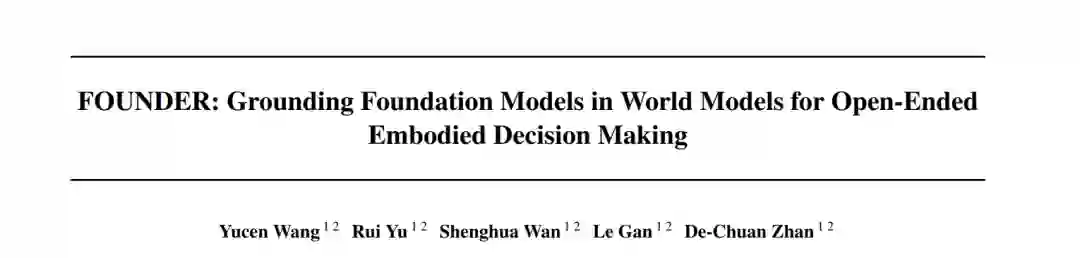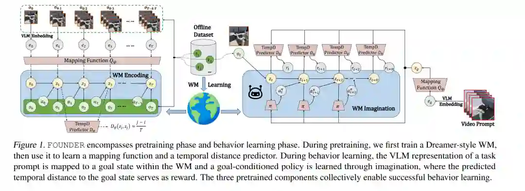 基础模型(Foundation Models, FMs)与世界模型(World Models, WMs)在任务泛化方面各具优势,分别作用于不同的抽象层级。在本文中,我们提出了一个新框架——FOUNDER,它融合了 FMs 所蕴含的可泛化知识与 WMs 的动态建模能力,从而在无奖励信号(reward-free)的具身环境中实现开放式任务求解。 我们的方法通过学习一个映射函数,将 FM 表征“对齐”到 WM 的状态空间,有效地根据外部观测推理出智能体在世界模拟器中的物理状态。通过该映射,系统可在行为学习阶段基于想象(imagination)训练出一个基于目标的策略(goal-conditioned policy),其中映射后的任务信息作为目标状态。 我们利用到目标状态的预测时间距离作为一种有信息量的奖励信号,辅助策略学习。在多个多任务的离线视觉控制基准测试中,FOUNDER 展现出优越的性能,尤其在任务由文本或视频指定、环境观测复杂或存在跨领域差异的情况下,显著优于现有方法,能够更准确地捕捉任务的深层语义。 我们还通过实证分析验证了 FOUNDER 学到的奖励函数与真实奖励之间的一致性。 项目主页:https://sites.google.com/view/founder-rl