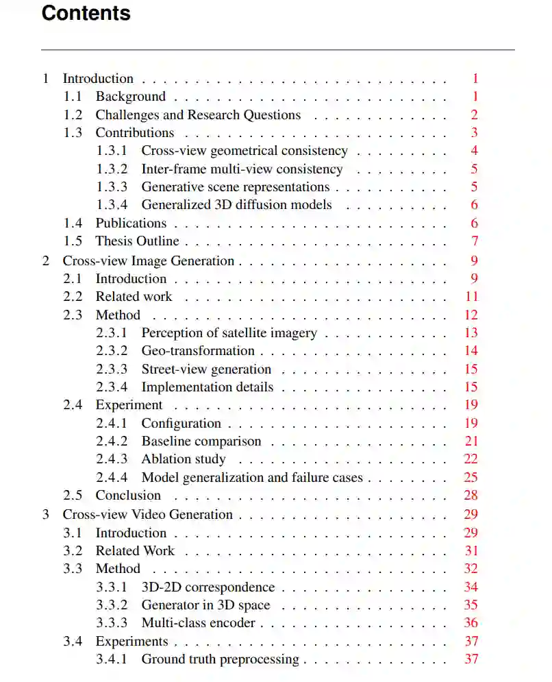 卫星影像的广泛可用性,例如在Google Earth等平台上的应用,极大地增强了人们绘制和可视化地球表面的能力。尽管卫星影像具有广覆盖性和易获取性,但其分辨率通常有限,缺乏探索感兴趣环境(尤其是城市区域)所需的细节。街景图像则在场景理解方面提供了重要的洞察力和实用性,从城市规划到户外导航,再到增强现实的多种应用都受益于街景图像。然而,获取街景图像成本高昂,并且需要频繁更新以保持准确性。相比之下,卫星影像更易获取且无处不在,因此成为生成街景图像的有前景替代方案。这一过程被称为卫星到地面跨视图合成(satellite-to-ground cross-view synthesis),因其广泛的实际应用前景而受到广泛关注。 从卫星图像直接生成地面视图需要克服显著的技术挑战,这主要是由于两类图像在视角和尺度上的巨大差异。本研究探讨了创新方法,旨在生成几何上一致且符合对应卫星图像的3D城市场景和街景图像,同时在不同视角之间保持强鲁棒的多视图一致性,并提升跨视图合成和大规模3D城市场景的质量和真实感。 为实现这一目标,我们首先在生成管线中引入了一种地理变换层(geo-transformation layer)。该层通过估算的地面高度值构建密集体素网格,并将信息从俯视图转换为街景视图,从而保留了物理的卫星到地面的关系,解决了几何一致性问题。接着,通过在几何中计算3D场景点云与帧像素之间的密集映射,我们提出了一种考虑点间空间关系的3D稀疏生成器,解决了在生成图像序列时的多视图一致性问题。此外,在隐式辐射场(implicit radiance field)爆炸性应用的背景下,我们进一步探索了神经场景表示在有限部分观测下完成3D场景的潜在生成能力。我们提出了一种基于稀疏网格表示的可扩展新视图合成管线,可以为大量不完整的场景数据填充合理的信息。
