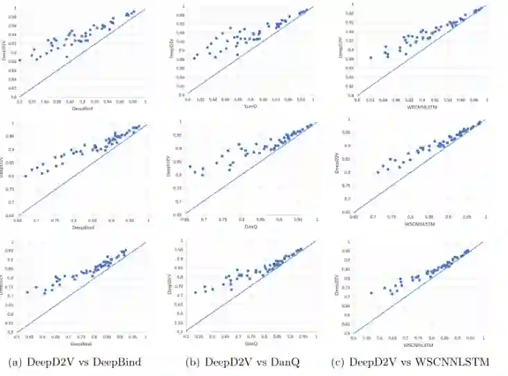图7.不同网络结构的比较为了更好地评估DeepD2V的性能,本文在50个ChIPseq基准数据集上比较了DeepD2V与三种基于深度学习的模型,包括DeepBind、DanQ和WSCNNLSTM。所有的竞争方法都使用它们的作者发布的源代码运行。此外,文章通过交叉验证优化这些竞争方法的超参数,使模型在测试集上达到最佳性能。这使得与本文的方法的性能比较是客观的。图8显示了50个ChIP-seq数据集上的AUCs和f1得分。散点图中的每个点表示同一数据集上两种方法的性能度量。位于对角线左上角的点表明,DeepD2V模型的性能优于相应的方法。从图8a可以看出,DeepD2V在f1评分和AUC指标上的表现明显高于DeepBind。这种优势可能归因于组合输入,并增加了一个RNN层,以捕获图案的长期依赖性,这在DeepBind中没有应用。此外,根据f1评分和AUC指标,DeepD2V的表现明显优于DanQ,如图8b所示。该结果证明dna2vec的分布式密集表示优于单热编码稀疏表示。如图8c所示,基于f1评分和AUC指标,DeepD2V的性能优于WSCNNLSTM,说明联合输入比原始DNA序列更能提取有效的基序特征。总之,DeepD2V的性能优于其他三种方法,在50个体内ChIP-seq数据集上的性能指标f1评分、PR AUC和ROC AUC均达到了最先进的性能。这三个指标在50个数据集上的平均得分如图9所示。不同数据集上的ROC AUC值如表2所示。这些结果一致表明,DeepD2V的性能优于DeepBind、DanQ和WSCNNLSTM。