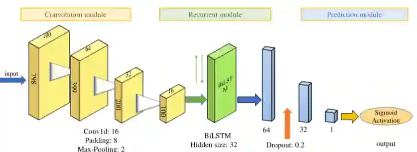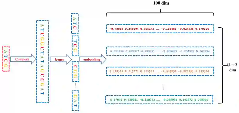 图1.序列转换表示图首先,从一个原始DNA序列推导出另外三个变异序列,包括互补序列、逆序列和互补逆序列。将四个序列按特定顺序连接到dna2vec方法中,得到分布式表示矩阵。然后,根据序列分析中常用的k-mer方法对组合序列进行分割。k -mer用于将一个序列分成多个以k为基数的子串。当步幅为1时,l个碱基的序列被分为(l−k + 1)个k-mer。例如,序列AGCCT被分成三个3-mers:(AGC, GCC, CCT)。因此,长度为l的DNA序列被拆分为具有k个碱基的k-mer子序列,形成一个长度为(l−k)/s+1的单词总数。本文把整个DNA序列看作一个句子,把k-mer片段看作组成句子的单词。因此,使用连续词袋模型(CBOW)模型来训练所有经过处理的序列语料库生成序列词向量。CBOW模型根据上下文预测目标词出现的概率。每个目标词都由一个100维向量表示。经过几轮迭代之后,每个长度为200 bps的原始基序列被转换为(798,100)矩阵。序列转换和表示如图1所示。 4.** 模型架构**