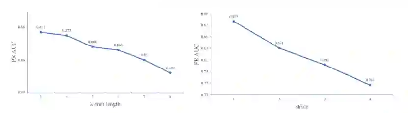 图3.LSTM具体计算公式上图中bo, bc, bi和bf是偏差,Wi, Wf, Wo, Uo, Uf和Ui是权重。两个全连通层和一个dropout层构成最后的预测模块,整合了从CNN和RNN模块中学习到的特征。Dropout被广泛应用于深度神经网络中,通过减少神经元之间复杂的自适应关系来进行正则化以避免过拟合。Dropout的比率通过交叉验证进行调优。最后,利用sigmoid函数计算蛋白质与dna结合的概率。 DeepD2V模型由PyTorch 1.0实现,源代码和数据集可在https://github.com/Sparkleiii/DeepD2V上获得。超参数从每个ChIP-seq数据集的搜索空间中随机采样,并通过交叉验证调整到最优值。本文通过Xavier均匀分布初始化所有权重,并初始化所有偏差为零。DeepD2V模型在20个周期内达到收敛,训练损失曲线逐渐减小,20个周期后趋于稳定。因此,本文将训练周期设置为20,选择验证集上ROC AUC值最高的模型作为最终的最佳模型。记录测试集上最佳模型的性能指标,并将三次交叉验证结果的平均值作为最终结果。根据前面研究的结果,将卷积核的个数设为16。 5. 实验结果本文首先用不同的步长和k-mer值评估了DeepD2V的鲁棒性。为了验证组合DNA序列对性能的改善,比较了不同输入条件下DeepD2V模型的性能。最后,将DeepD2V与仅使用CNN、RNN或Bi-LSTM模块的其他简化模型进行比较。为了进行系统性能评估,本文章将DeepD2V与其他四种最先进的蛋白质-DNA结合方法进行了比较,包括DanQ、DeepBind、WSCNN和WSCNNLSTM。在50个ChIP-seq基准数据集上进行了性能比较实验。鉴于本文使用dna2vec方法来获得每个k-mer的分布式矢量表示,通过实验比较k和s值的不同组合在Gm12878细胞系的23个ChIP-seq数据集上的性能,可以确定k和步长s的最佳值。如图4所示,当k的值增大时,模型的性能逐渐下降。该模型在k = 3时的性能更好。文章认为,这一结果可能是由于三个碱基组成一个氨基酸,而k = 3恰好抓住了序列的生物学本质。对于后续的步长s调整,于是将k设置为3,然后使用网格搜索s的最优值。