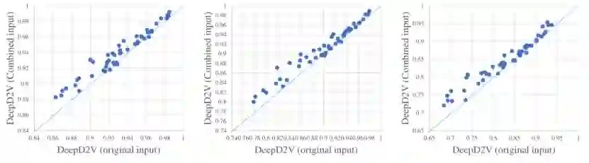 图5.使用单热编码的DeepD2V与dna2vec在50个活体数据集上的性能比较对于双链DNA序列,DeepD2V训练时会考虑反向或互补序列,因为蛋白质可能会与DNA互补链或反向序列链结合。因此,本文再次探讨了组合序列和原始DNA序列的意义。图6显示了DeepD2V在所有50个基准数据集上以原始DNA序列和组合序列作为输入的性能。可以发现,与原始DNA序列相比,组合序列在三个性能指标上都大大提高了DeepD2V的性能。认为组合序列可能捕获不同DNA序列模式之间的高阶依赖关系,如隐式DNA形状。