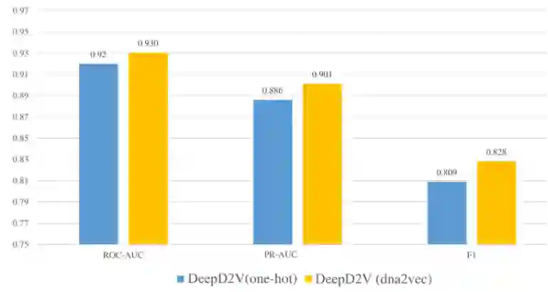 图4.不同k-mer长度和步长的比较图4显示,步幅越大,模型的性能越差。这一结果可能是由于大跨步导致了细粒度序列信息的丢失。先前的研究鼓励使用较大的k-mer长度值,并表明较小的步幅值(s = 1)可能会降低嵌入算法的性能。然而,在本文章的实证实验中,发现当stride和k-mer长度(k = 3和s = 1)值较小时,模型的性能优于其他k和s的组合。因此,在接下来的性能比较实验中,将k和s的值分别设为3和1。注意,该实验使用原始DNA序列作为输入,而不是组合序列。本文的模型采用word2vec来构造k-mers的分布式表示,而不是k-mers的单一热编码。虽然词嵌入技术已广泛应用于自然语言处理领域,但在蛋白质与dna结合的研究中仍很少应用。为了验证dna2vec的优势,本文在50个公开的体内ChIP-seq基准数据集上进行了几个比较实验。图5展示了使用单热编码和dna2vec的DeepD2V在平均AUC和f1评分指标下的性能。由此文章可以得出结论,使用dna2vec的DeepD2V在所有三个指标上都明显优于单热编码。