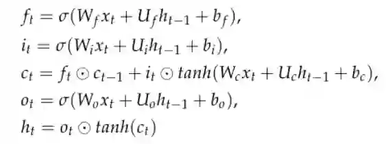 图2.网络架构本文中DeepD2V的图解如图2所示。卷积模块用于从输入序列中提取特征,Bi-LSTM模块用于捕获高阶特征,然后是两个全连接层和一个dropout层进行预测。与RNN相比,一维卷积神经网络可以缩短序列,提取基序的高阶特征,且处理较长的生物序列时需要较少的计算成本。因此,本文在RNN之前使用一维卷积模块。每个卷积模块由一维卷积层、ReLU层和最大池化层组成。卷积层负责用指定数量的滤波器内核捕获motif特征。采用Relu作为激活函数,可以有效地减少梯度下降和反向传播,避免梯度爆炸和梯度消失。最后,采用最大池化层来减少卷积层输出的冗余信息,并在滤波器中选择最大响应。长短时记忆(LSTM)是RNN的一种变体,解决了传统RNN不能长期依赖的问题。考虑到DNA序列的双链结构,选择bi-LSTM进行长期提取序列中的特征,t位置双LSTM单元具体计算公式如下图3所示: