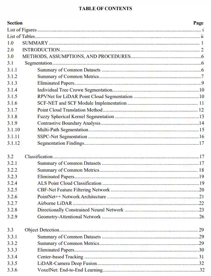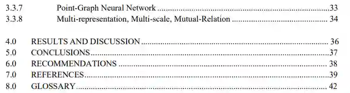 3DLIVE努力的目标之一是创建一个系统(利用机器学习),该系统接收一个地理区域的点云,将具有类似属性的点分组为对象,并为每个组成对象和结构贴上标签,使数据更容易使用和分析。在我们着手实现这些目标之前,我们确定研究当前点云数据集的分割和分类技术状况将是有价值的。Guo等人在2019年完成了一项关于点云的深度学习方法的调查[1]。我们的目的是确认研究中提出的信息仍然是准确和相关的(针对点云数据集的ML是一个快速发展的领域),进行我们自己的研究并创建一个类似的调查,并决定在研究的分类、分割和目标检测的方法中,哪些是最适合我们的使用案例的。AFRL RIEA/RIED内部研究小组(IHURT)被召集起来,与3DLIVE团队一起做这项研究,并回答以下研究问题: