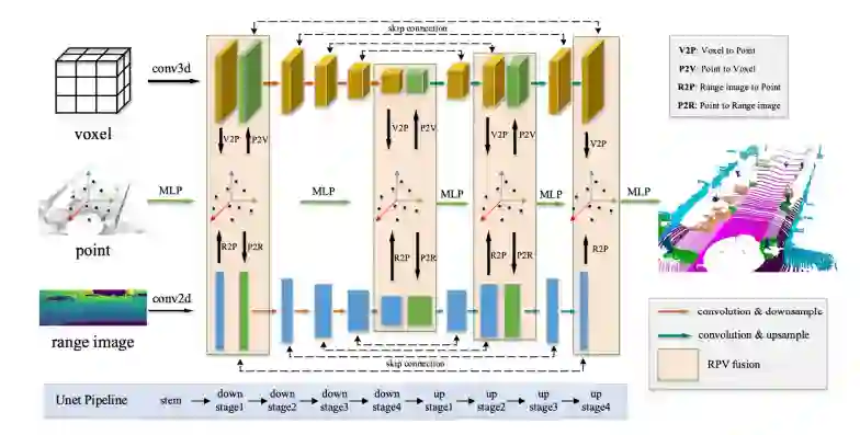 图2. RPVNet的概述。它是一个具有多种交互作用的三分支网络,其中体素分支和范围分支共享类似的Unet架构,而点分支只利用每点的MLPs。