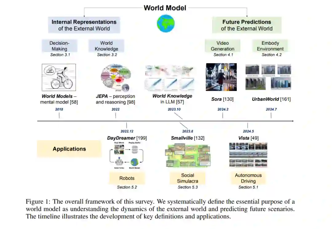 世界模型的定义仍然是一个持续争论的话题,通常可以分为两个主要视角:理解世界和预测未来。如图1所示,Ha和Schmidhuber [59] 的早期工作专注于抽象化外部世界,以深入理解其内在机制。与此相对,LeCun [98] 认为,世界模型不仅应当感知和建模现实世界,还应具备展望可能未来状态的能力,从而为决策提供指导。像Sora这样的生成视频模型代表了一种更加侧重于模拟未来世界演变的方式,因此,它们与世界模型的预测性方面更为契合。这引发了一个问题:世界模型应优先理解当前世界,还是预测未来状态?本文将从这两个视角出发,提供关于世界模型文献的全面回顾,突出关键方法和挑战。