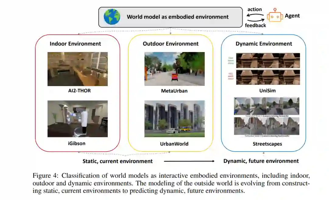 外部世界的未来预测(第4节):我们首先探讨了模拟外部世界的生成模型,主要使用视觉视频数据。这些工作强调了生成的视频与未来物理世界状态的真实性。随着近期研究将焦点转向开发真正互动的物理世界,我们进一步研究了从视觉到空间表征的过渡,以及从视频到具身环境的转变。这包括全面探讨与生成具身环境相关的研究,这些环境能够模拟外部世界。