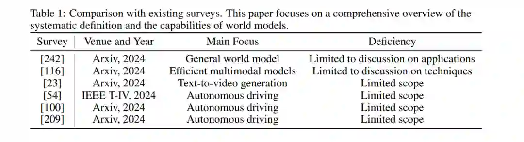 现有的世界模型综述大致可分为两类,如表1所示。第一类综述主要集中在描述世界模型在特定领域的应用,如视频处理与生成[23, 242]、自动驾驶[54, 100, 209]和基于代理的应用[242]。第二类综述[116]则侧重于多模态模型向世界模型的技术过渡,这些模型能够处理跨多种模态的数据。然而,这些论文往往缺乏对世界模型究竟是什么以及不同实际应用对这些模型的需求的系统性探讨。在本文中,我们旨在正式定义和分类世界模型,回顾近期的技术进展,并探索它们广泛的应用。