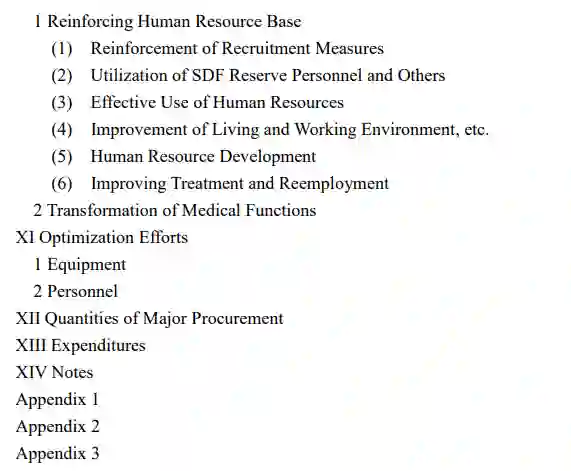 在日本人口老龄化、出生率下降、新兵增加无望的情况下,防务省和自卫队将全面推进强化人才基础的各种措施,如加强征兵工作、利用自卫队后备役人员等、促进女性参与、提高自卫队军警人员的退休年龄、利用包括自卫队退役军警人员在内的多样化优秀人才、改善生活和工作环境、开发人力资源、改善待遇、支持再就业等。