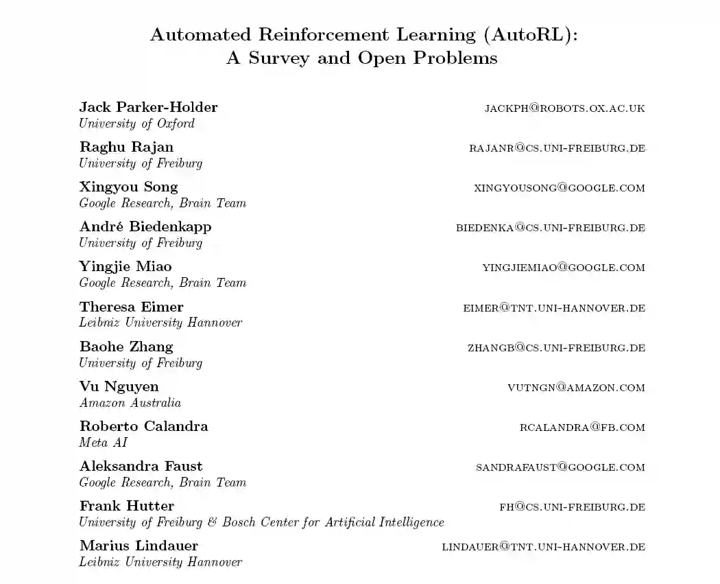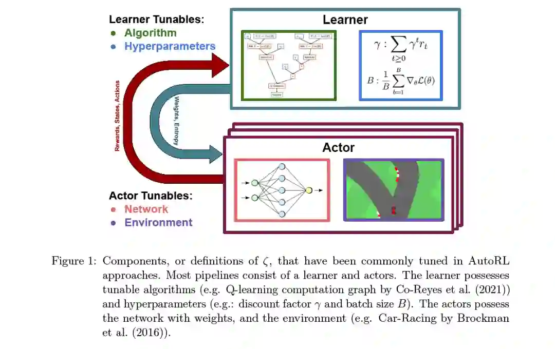 这项综述的目的是展示自动强化学习(AutoRL)领域,作为一套方法,在不同程度上自动化RL流程。AutoRL服务于解决各种各样的挑战: 一方面,RL算法的脆弱性阻碍了在新领域的应用,特别是在从业者缺乏大量资源来搜索最优配置的领域。在许多设置中,为一个完全看不见的问题手动查找甚至是中等强度的超参数集都可能是非常昂贵的。AutoRL已经被证明可以在这种情况下帮助解决重要问题,例如设计RNA (Runge et al.,2019年)。另一方面,对于那些受益于更多计算的人来说,增加算法的灵活性显然可以提高性能(Xu et al.,2020; Zahavy et al.,2020; Jaderberg et al.,2017)。这已经在著名的AlphaGo智能体中得到了展示,它通过使用贝叶斯优化(BO)得到了显著的改进(Chen et al., 2018)。早在20世纪80年代(Barto & Sutton, 1981),可被认为是AutoRL算法的方法就被证明是有效的。然而,近年来AutoML的流行导致了更先进技术的初步应用(Runge et al.,2019; Chiang et al., 2019)。与此同时,进化群体几十年来一直在进化神经网络及其权重(Stanley & Miikkulainen, 2002),其中的方法鼓舞了那些被证明对现代RL有效的方法(Jaderberg et al.,2017)。此外,最近元学习的流行导致了一系列寻求自动化RL过程的工作(Houthooft et al., 2018; Xu et al., 2018; Kirsch et al., 2020)。
