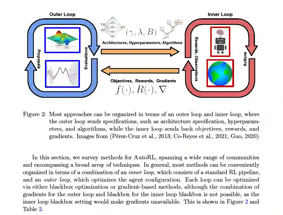 我们的论文结构如下。在第2节中,我们描述了形式化AutoRL问题所需的背景和符号,然后形式化这个问题,并讨论了评估它的各种方法。然后,我们简要地总结了各种类型的RL算法,然后描述了AutoRL问题特有的非平稳性。在第3节中,我们讨论了需要自动化的AutoRL问题的各种组件,包括环境、算法、它们的超参数和架构。在第4节中,我们提供了一个分类,并在该分类之后的子节中调研了当前的AutoRL方法。在第5节中,我们将讨论各种公开可用的基准测试及其应用领域。最后,在第6节中,我们讨论了AutoRL的未来方向。