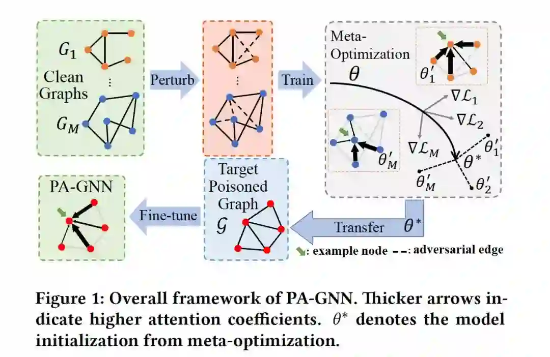 摘要:图神经网络(GNNs)有着广泛的应用。然而,他们在对抗攻击的鲁棒性方面是不行的。先前的研究表明,对图拓扑或节点特征使用不明显的修改会大大降低GNN的性能。设计强大的图神经网络以防止poisoning attack是一项非常具有挑战性的工作。现有工作的目标是仅使用poisoned图来减少adversarial edge的负面影响,这是次优的,因为它们无法区分adversarial edge和normal edge。另一方面,来自与目标poisoned图类似领域的clean图在现实世界中通常是可用的。通过扰动这些clean图,我们创建了监督知识来训练检测adversarial edge的能力,从而提高了GNN的鲁棒性。然而,现有的工作忽略了这种clean图的潜力。为此,我们研究了一个新的问题,通过研究clean图来提高GNNs对poisoning attack的鲁棒性。具体而言,我们提出了PA-GNN,它基于一种惩罚性聚合机制,通过分配较低的注意力系数来直接限制adversarial edge的负面影响。为了优化一个poisoned图的PA-GNN,我们设计了一种meta-optimization算法,训练PA-GNN使用clean图和其adversarial图惩罚扰动,并将这种能力迁移到poisoned图上,以提高PA-GNN的鲁棒性。在四个真实数据集上的实验结果证明了PA-GNN对图数据poisoning attack的鲁棒性。