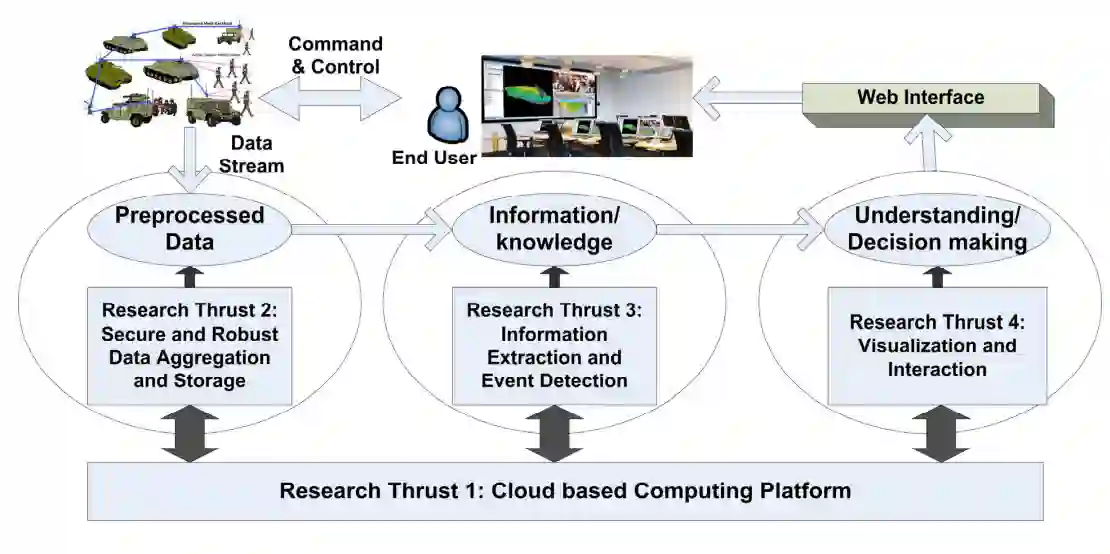 CREDIT 中心旨在应对这些基本挑战,并为美国国防部的关键任务应用提供传感、感知和决策支持。具体而言,提出并开发了一种集成计算、通信和信息融合的方法。目前已经开展了四项研究: (1) 实时军事大数据云计算系统的系统架构设计;(2) 利用边缘计算和计算卸载实现安全、稳健的数据收集和聚合;(3) 新型机器学习和深度学习算法,用于使用高维数据集进行自动检测,以及在标记数据有限的情况下进行半监督学习;(4) 在云上实时实现海量数据集的可视化,并通过实验验证研究成果。它们共同提供了对动态环境中感兴趣的对象和事件之间关系的研究,并利用特定功能流程或应用中的数据来实现可操作的特定背景洞察力。所提出的设计和方法已通过大量模拟和实验进行了验证,并以无人驾驶飞行器进行物体检测和跟踪为案例进行了研究。