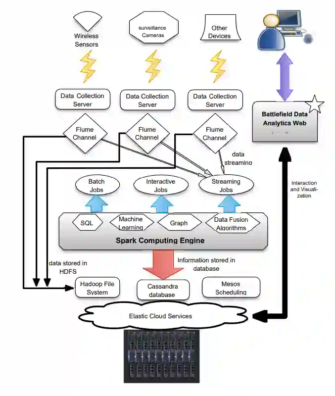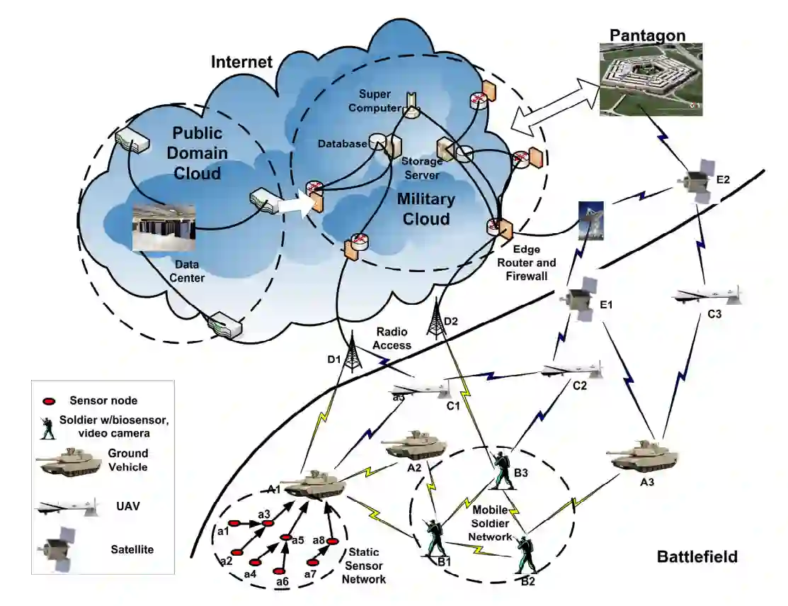 如今,军事情报分析人员面临着处理来自多个来源的海量复杂数据的艰巨任务,而且任务量还在不断增加。其中包括传感器数据、移动社交网络数据、监视数据(如无人机或卫星拍摄的图像和视频)以及公共领域数据。图 1 给出了一个示例场景。必须对这些数据进行汇总、评估、关联,并最终用于支持指挥官的关键决策和行动。然而,目前缺乏处理军事行动中来自异构来源的海量数据的能力[1, 2]。目前存在许多挑战,例如:(1)需要设计和优化用于军事大数据的实时计算平台,因为海量数据分布在不同地点;(2)必须在敌对环境中聚合异构数据并妥善存储;(3)需要以最小的延迟完成分布式态势感知和决策制定;(4)必须呈现海量数据集和复杂结果,以便分析人员轻松感知。