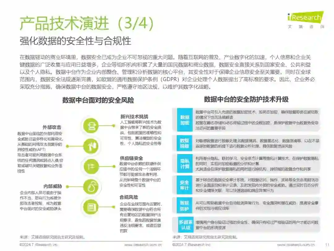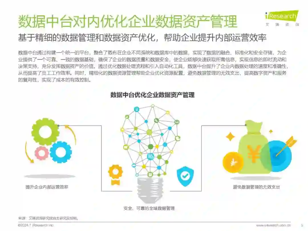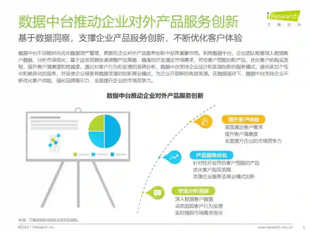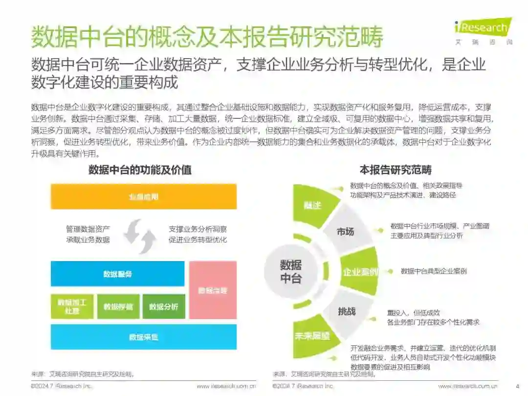 数据中台的概念及本报告研究范畴 数据中台可统一企业数据资产,支撑企业业务分析与转型优化,是企业 数字化建设的重要构成 数据中台是企业数字化建设的重要构成,其通过整合企业基础设施和数据能力,实现数据资产化和服务复用,降低运营成本,支撑业务创新。数据中台通过采集、存储、加工大量数据,统一企业数据标准,建立全域级、可复用的数据中心,增强数据共享和复用,满足多方面需求。尽管部分观点认为数据中台的概念被过度炒作,但数据中台确实可为企业解决数据资产管理的问题,支撑业务分析洞察,促进业务转型优化,带来业务价值。作为企业内部统一数据能力的集合和业务数据化的承载体,数据中台对于企业数字化升级具有关键作用。 数据中台对内优化企业数据资产管理 基于精细的数据管理和数据资产优化,帮助企业提升内部运营效率 数据中台通过构建一个统一的平台,整合了散布在企业不同系统和数据库中的数据,实现了数据的融合、标准化和安全存储,为企业提供了一个可靠、一致的数据基础,确保了企业的数据质量和数据安全,使企业能够快速获取所需信息,实现信息的即时流动和决策支持,充分发挥数据资产的价值。通过优化数据处理流程和引入自动化工具,数据中台提升了企业内数据处理的速度和准确性,从而提高了员工工作效率。同时,精细化的数据资源管理帮助企业优化资源配置,避免数据管理的无效支出,提高数字资产和服务的复用性,实现了成本的有效控制。 数据中台推动企业对外产品服务创新 基于数据洞察,支撑企业产品服务创新,不断优化客户体验 数据中台不仅能对内优化数据资产管理,更能在企业对外产品服务创新中发挥重要作用。利用数据中台,企业团队能够深入挖掘客户数据、分析市场变化,基于这些洞察快速调整产品策略,精准地开发满足市场需求、符合客户预期的新产品,优化客户的购买流程,提升客户满意度和忠诚度。通过对客户行为和反馈的系统分析,数据中台支持企业设计和实施创新的服务模式,提供更加个性化和差异化的服务,并促使企业探索有数据支撑的创新商业模式,为企业开辟新的收益来源。在数据驱动下,数据中台支持企业不断优化客户体验,强化品牌吸引力,全面提升企业的市场竞争力。