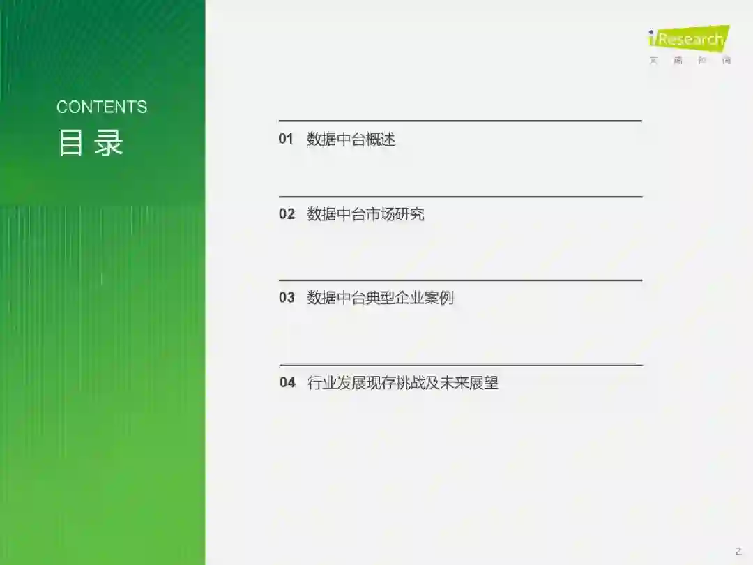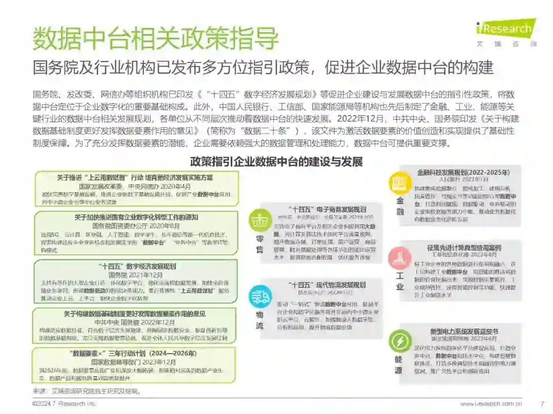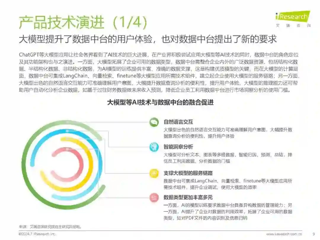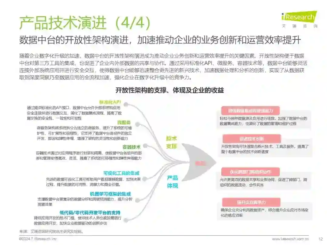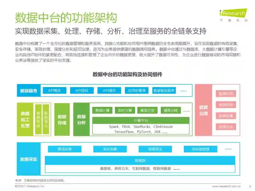 数据中台的概念及本报告研究范畴 数据中台可统一企业数据资产,支撑企业业务分析与转型优化,是企业 数字化建设的重要构成 数据中台是企业数字化建设的重要构成,其通过整合企业基础设施和数据能力,实现数据资产化和服务复用,降低运营成本,支撑业务创新。数据中台通过采集、存储、加工大量数据,统一企业数据标准,建立全域级、可复用的数据中心,增强数据共享和复用,满足多方面需求。尽管部分观点认为数据中台的概念被过度炒作,但数据中台确实可为企业解决数据资产管理的问题,支撑业务分析洞察,促进业务转型优化,带来业务价值。作为企业内部统一数据能力的集合和业务数据化的承载体,数据中台对于企业数字化升级具有关键作用。 数据中台对内优化企业数据资产管理 基于精细的数据管理和数据资产优化,帮助企业提升内部运营效率 数据中台通过构建一个统一的平台,整合了散布在企业不同系统和数据库中的数据,实现了数据的融合、标准化和安全存储,为企业提供了一个可靠、一致的数据基础,确保了企业的数据质量和数据安全,使企业能够快速获取所需信息,实现信息的即时流动和决策支持,充分发挥数据资产的价值。通过优化数据处理流程和引入自动化工具,数据中台提升了企业内数据处理的速度和准确性,从而提高了员工工作效率。同时,精细化的数据资源管理帮助企业优化资源配置,避免数据管理的无效支出,提高数字资产和服务的复用性,实现了成本的有效控制。 数据中台推动企业对外产品服务创新 基于数据洞察,支撑企业产品服务创新,不断优化客户体验 数据中台不仅能对内优化数据资产管理,更能在企业对外产品服务创新中发挥重要作用。利用数据中台,企业团队能够深入挖掘客户数据、分析市场变化,基于这些洞察快速调整产品策略,精准地开发满足市场需求、符合客户预期的新产品,优化客户的购买流程,提升客户满意度和忠诚度。通过对客户行为和反馈的系统分析,数据中台支持企业设计和实施创新的服务模式,提供更加个性化和差异化的服务,并促使企业探索有数据支撑的创新商业模式,为企业开辟新的收益来源。在数据驱动下,数据中台支持企业不断优化客户体验,强化品牌吸引力,全面提升企业的市场竞争力。