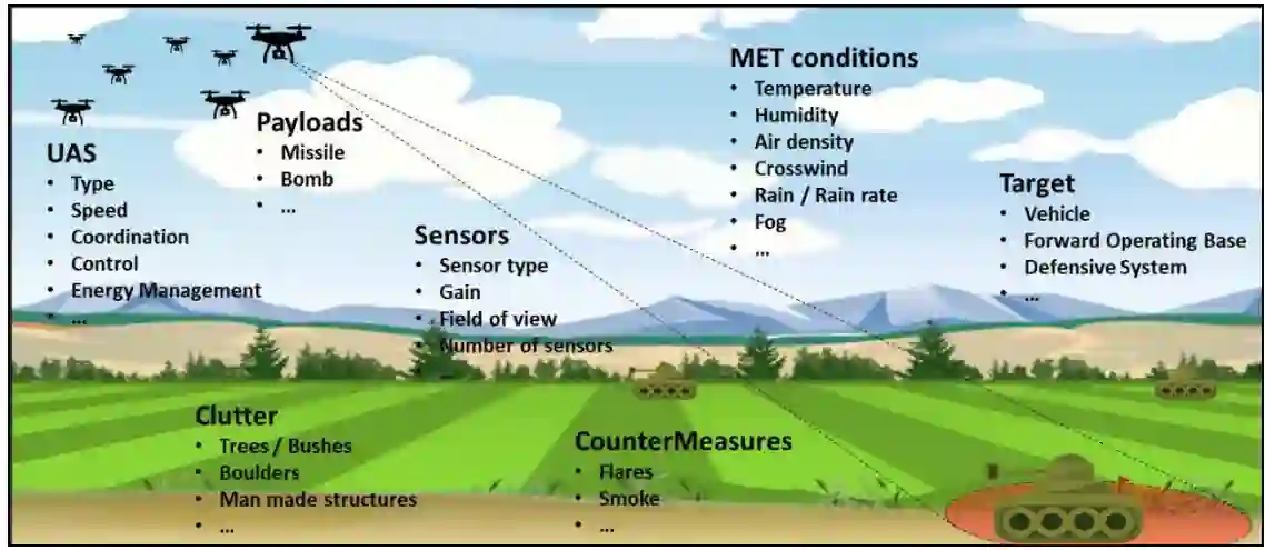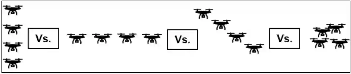 由于测试设施的限制和约束,通过物理实验来评估当前防御系统对抗各种蜂群威胁场景的有效性具有挑战性。此外,由于尚未观察到大规模的协同无人机攻击,因此定义用于评估性能的威胁目标也很困难。鉴于存在多种蜂群控制策略,如下图所示,涉及大规模协同无人机攻击的场景必须覆盖广泛的范围。此外,需要进行测试的蜂群场景几乎是无限的,这进一步复杂化了整个过程。仅通过物理实验来评估针对可配置威胁的对抗措施的有效性是不切实际的,尤其是随着场景复杂度的增加。这突显了对M&S方法的需求,该方法需要像威胁本身一样具有可扩展性和适应性,从而能够针对此类威胁进行快速原型设计和系统效能评估。