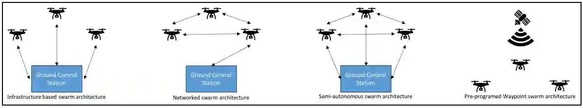 这种威胁在运动、编队、目标和有效载荷方面的未定义性和不可预测性,加上其低廉的制造成本,使其成为一种前所未见的挑战。成本不对称是开发应对此威胁解决方案时产生大部分复杂性的主要驱动因素,而这种威胁能够压倒许多系统。最重要的是,“恐怖组织手中廉价、简陋的蜂群,能以极低的成本造成堪比复杂武器系统的破坏。” 下图展示了无人机运用的几种架构类型,每种类型在生成应对此类威胁的解决方案时都带来了不同的挑战,特别是在非受控环境中基础设施可能未知的情况下。