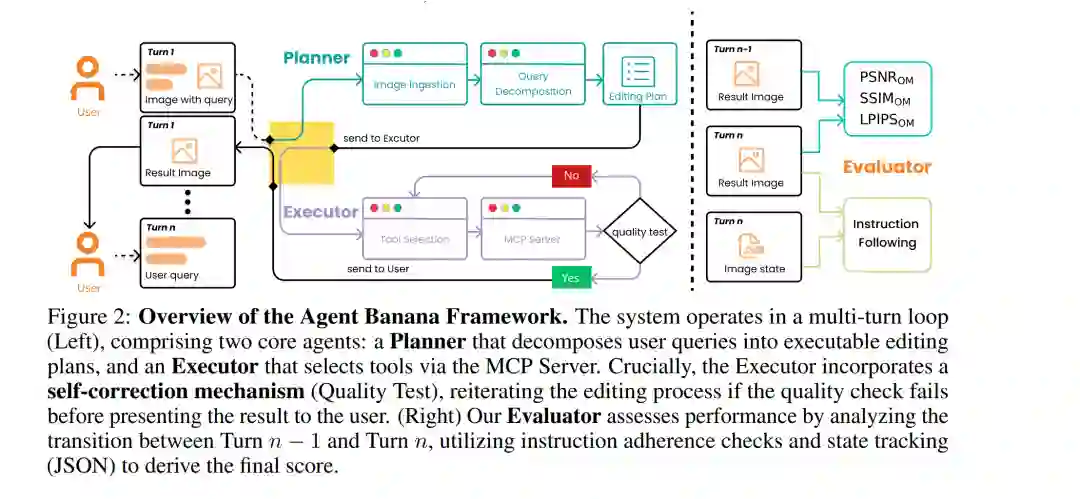 基于指令的图像编辑 [3, 54, 40, 10, 18, 4, 33, 45, 27] 使客户能够通过自然语言命令修改图像,并已成为现代生成式视觉系统的核心能力。基础模型(特别是扩散模型 [14, 26] 和自回归 Transformer [42])的近期进展,显著提升了图像的逼真度(Photorealism)和指令遵循能力,为商业系统(如 GPT-4o [33], Gemini 2.5 Flash Image [8])和强力开源模型(如 Flux-1 [20], Qwen-Image-Edit [44])中的实用编辑体验提供了动力。 尽管进展迅速,但目前的生成式编辑器 [44, 27, 17] 与专业工作流的需求之间仍存在巨大差距。在摄影 [16]、平面设计 [28]、视觉特效(VFX)及电影制作 [56] 等高要求场景中,用户通常处理原生高分辨率资产(通常为 4K 或更高),并要求精确的局部修改,且须完整保留所有非目标内容 [17]。相比之下,当今的模型往往在降低的分辨率下运行或依赖下采样,导致难以维持精细的纹理和清晰的边界。此外,它们频繁表现出过度编辑(Over-editing)效应,无意中改变了用户意图之外的区域,或降低了全局语义连贯性。最后,它们在处理多目标或顺序性 [59] 的复杂请求时显得力不从心;在这类场景下,成功取决于能否对指令进行分解、验证中间结果并在多轮交互中修正先前的决策。 我们认为,为了弥合这一差距,下一代编辑工具必须具备四项核心能力:① 意图理解与分解,将复杂请求拆解为原子级的子编辑任务;② 精确局部编辑,确保编辑被精准应用,同时在原生分辨率下保持其余内容不变;③ 状态跟踪与回滚,保留多轮交互中的中间步骤,以便用户(或智能体)能够轻松返回上一步并重新规划后续步骤;④ 高分辨率原生编辑,直接在原生 4K 图像上操作,避免下采样以保留细粒度纹理和锐利边界。 为此,我们推出了 Agent Banana。这是一个具备智能体属性、图层感知(Layer-aware)的图像编辑框架,它将高层级推理与规划能力与工具调用能力相结合,受益于愿景语言模型(VLMs)在图像理解、推理和工具调用方面的飞速进步 [15, 36, 46, 47, 34, 1]。Agent Banana 将“氛围感(Vibe)”类型的提示词分解为离散的单目标步骤,并利用“Photoshop 式”的图层隔离、掩模(Masking)和局部编辑来执行这些步骤。Agent Banana 还包含一种自我反思机制(Self-reflection mechanism) [50, 38],允许其在推理阶段进行重试、回滚和重新规划。至关重要的是,Agent Banana 围绕两种专为长程、高分辨率编辑量身定制的机制构建:上下文折叠(Context Folding),将长对话历史压缩为结构化记忆,以实现跨轮次的稳定状态跟踪;以及图像图层分解(Image Layer Decomposition),在隔离的高分辨率图层上执行编辑,从而保留非目标内容并防止迭代过程中的漂移。 为了评估在现实步进依赖(Stepwise dependencies)下的多轮高定义编辑,我们构建了 HDD-Bench。这是一个专为模拟专业编辑工作流而设计的高定义、基于对话的基准测试。与以往主要采用单轮或轮次间弱依赖的基准测试 [10, 18, 4, 45, 27, 51] 不同,HDD-Bench 具有逻辑相关的指令链,其中每一轮都会诱发一个定义明确的状态转换,并可进行逐步验证。HDD-Bench 在原生分辨率下对指令遵循、编辑局部性、多轮一致性和整体视觉保真度进行基准测试。为了减少评估的歧义性,我们进一步引入了一种基于图(Graph-based)的评估协议,用于跟踪跨轮次的对象状态转换,通过对目标编辑是否应用以及非目标区域是否保留进行局部、轮次级的检查,来补充全局感知指标。