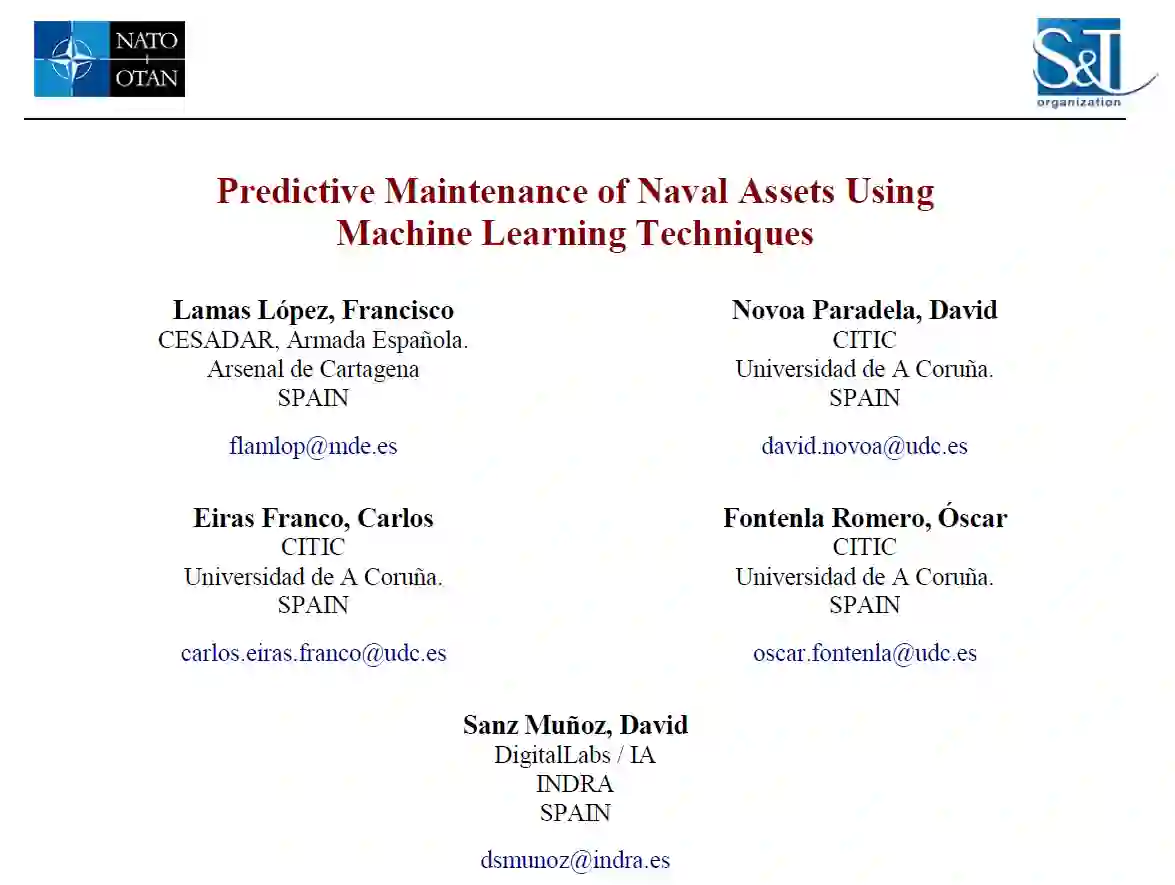 在工业资产运行过程中出现的异常情况可能表明存在退化和故障,随着时间的推移,会导致不期望的行为、运行条件的丧失以及系统的最终崩溃。预测性维护技术负责监测系统的状态,以便在初始阶段对这些异常情况进行检测,从而以最佳方式安排维护任务。本文介绍了一种基于机器学习的人工智能技术的海军资产预测性维护解决方案。为此,使用了由船舶实时收集并通过控制中心传输的传感器(温度、压力等)的信息。所开发的系统(SOPRENE)能够从我们军舰上的发动机的历史数据中预测不同的故障模式或异常运行状况的发生。此外,该系统的使用可扩展到大型舰队,该解决方案已使用Spark分布式环境来实现,以促进预测的分布式计算。