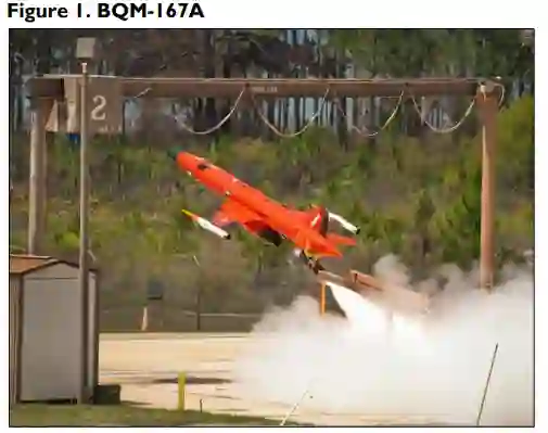 BQM-167A 空军分级空中靶机(AFSAT)。BQM-167A (见图 1)是一种可回收的亚音速空中靶机,主要用于模拟空对空交战。复合材料工程公司(现为克拉托斯防务与安全解决方案公司)于 2000 年开始为空军的 AFSAT 计划研制 BQM-167A,该计划旨在取代冷战时期的 MQM-107 和 BQM-34 靶机无人机。2001 年,复合材料工程公司进行了 BQM-167A 的首飞,次年空军将该飞机选入 AFSAT 计划。BQM-167A 于 2008 年达到初始作战能力。