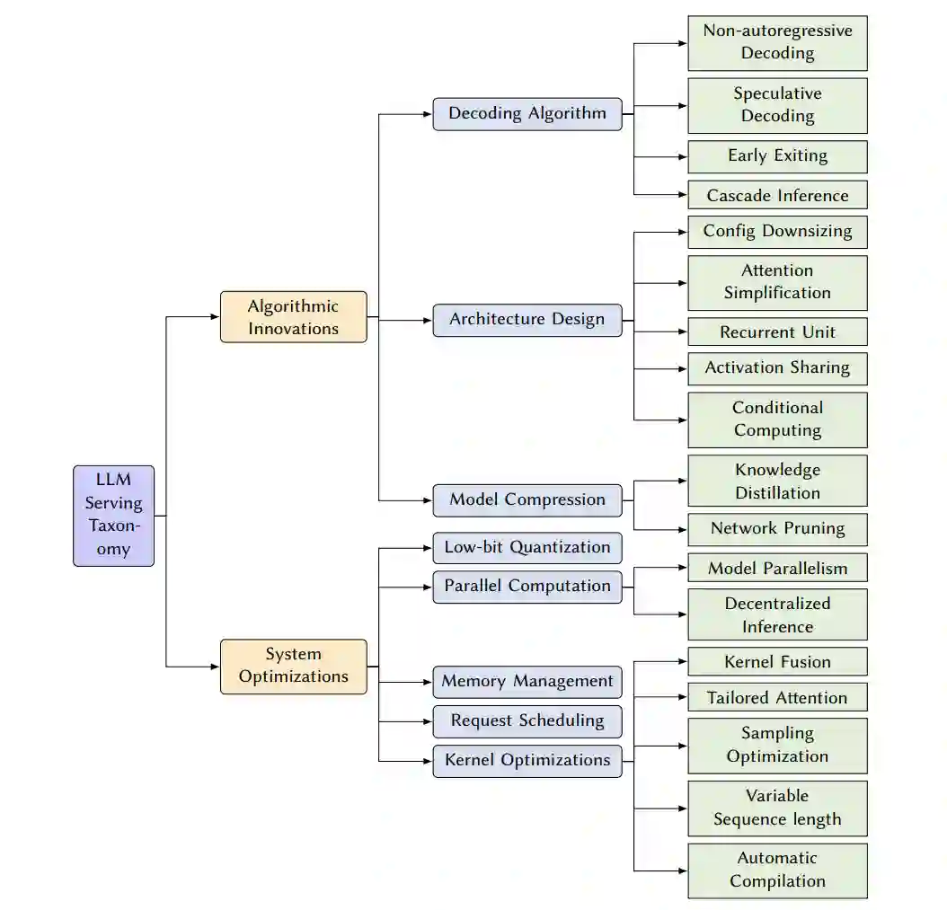 目标 这项综述的主要目标是提供一个全面的概述,关于最新的LLM服务和推理方面的进展。我们将系统地回顾和分类现有技术,基于它们的底层方法,突出它们的优势和局限性。该综述将涵盖广泛的方法论,包括解码算法、架构设计、模型压缩、低比特量化、并行计算、内存管理、请求调度和内核优化。