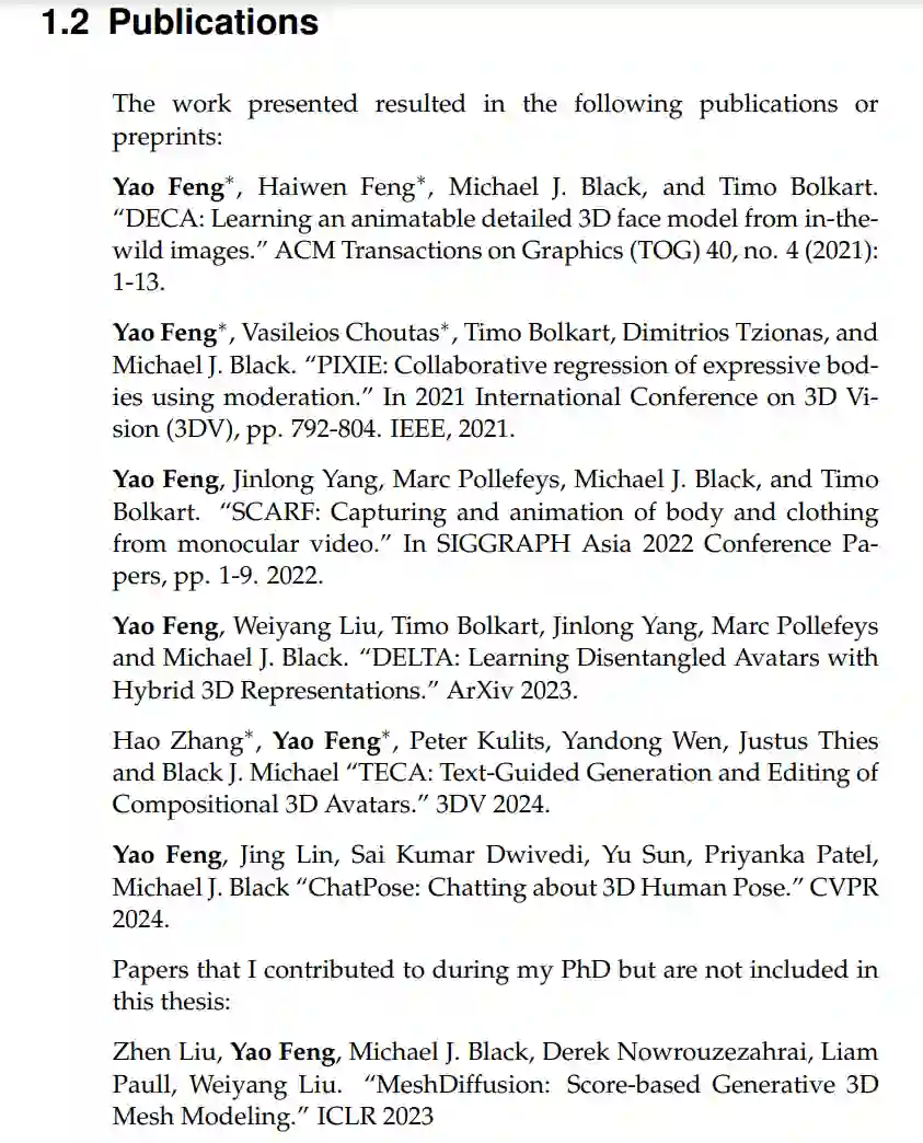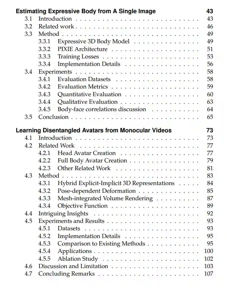 数字人类的研究在计算机视觉、计算机图形学和机器学习等研究领域中引起了广泛关注。这一日益增长的兴趣源于理解人类自我及数字人类在各种应用中的关键作用,包括增强现实/虚拟现实(AR/VR)中的虚拟存在、数字时尚、娱乐、机器人学和医疗健康等领域。然而,数字人类在跨学科应用中的广泛使用面临两大挑战:(1)捕捉的难度,因为现有方法依赖于复杂的系统,这些系统既耗时、劳动密集,又成本高昂;(2)理解的缺乏,即使在创建了数字人类之后,仍然存在对其三维表示的理解缺口,且将其与更广泛的世界知识整合的能力有限,从而限制了其有效利用。克服这些挑战对于释放数字人类在跨学科研究和实际应用中的潜力至关重要。 为了解决这些挑战,本论文结合了计算机视觉、计算机图形学和机器学习的研究成果,开发了可扩展的数字人类捕捉和建模方法。这些方法包括使用图像、视频和文本描述等易获取的数据捕捉面部、身体、手部、头发和服装。更重要的是,我们不仅仅局限于捕捉,而是将研究范式转向理解和推理,借助大语言模型(LLMs)。例如,我们开发了第一个基础模型,它不仅能够从单张图像中捕捉三维人体姿势,还能够通过整合世界知识推理一个人在三维空间中的潜在下一步动作。本论文统一了从视觉和语言数据中捕捉和理解数字人类的过程——正如人类通过观察和解读世界的视觉和语言信息来理解世界一样。 我们的研究首先开发了一个框架,用于从“野外”图像中捕捉详细的三维面部。该框架能够从单张图像中生成高度逼真且可动画化的三维面部,且无需配对的三维监督训练,在形状重建方面达到了最先进的精度。它有效地解耦了身份和表情细节,从而允许以不同表情动画化估计的面部。人类不仅仅是面部,我们接着开发了PIXIE,一种能够从单张图像估算具有逼真面部细节的可动画化全身三维虚拟人方法。通过引入注意力机制,PIXIE超越了之前的方法,精度更高,并能够创建表现力丰富、高质量的三维人类。 除了人类身体外,我们还提出了SCARF和DELTA方法,用于从单目视频中捕捉分离的身体、服装、面部和头发,采用混合表示方法。由于服装和头发具有复杂的拓扑结构,使用像神经辐射场(NeRFs)这样的隐式表示方法来建模更为合适,而人类身体则更适合用网格(mesh)表示。SCARF通过将基于网格的人体与NeRFs服装和头发进行整合,结合了两者的优势。为了直接从单目视频中进行学习,我们引入了基于网格的体积渲染技术,使得可以直接从二维图像数据优化模型,而不需要三维监督。得益于解耦的建模方式,捕捉到的虚拟人服装可以迁移到任意体型上,这使其在虚拟试穿等应用中具有特别的价值。基于SCARF的混合表示,我们提出了TECA,它利用文本生成图像模型来创建逼真且可编辑的三维虚拟人。TECA比现有方法生成更为真实的虚拟人,并且允许进行编辑,得益于其组合设计。例如,用户可以输入“一个瘦女人,留着脏辫”这样的描述,生成带有纹理的三维头部网格和用于头发的NeRF模型。它还支持在虚拟人之间转移基于NeRF的发型、围巾和其他配件。 尽管这些方法使捕捉人类变得更加可行,但更广泛的应用仍然需要理解人类行为的背景。传统的姿势估计方法通常通过裁剪图像来孤立主体,这限制了它们对完整场景的理解和推理能力。为了解决这个问题,我们开发了ChatPose,这是第一个用于理解和推理三维人体姿势的模型。ChatPose利用多模态的大语言模型(LLM),通过微调一个投影层将嵌入解码为三维姿势参数,进一步通过SMPL人体模型解码为三维人体网格。通过同时在文本到三维姿势和图像到三维姿势数据上进行微调,ChatPose首次展示了大语言模型能够直接推理三维人体姿势。这一能力使得ChatPose能够描述人类行为,生成三维姿势,并推理潜在的下一步动作,将感知与推理相结合。 我们相信,本论文在扩大数字人类捕捉规模和推进三维人类理解方面的贡献,有潜力塑造未来以人为中心的研究,并推动其在各个领域的广泛应用。