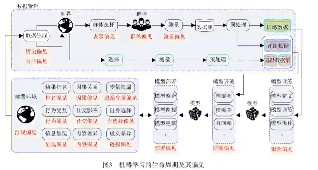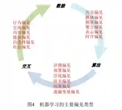 Friedman 和 Nissenbaum 首先开展了偏见相关 方面的研究,给出了计算机系统中偏见分析的一个 框架,并结合应用案例进行了阐释[8]。Baeza-Yates 从数据、算法和用户交互等方面对网页生态系统中 的相关偏见进行了定义和剖析[57]。Olteanudeng 等 分析了数据平台及其相关技术特征,从产生的来源 和表现的形式,阐述总结了社交数据相关的偏见 [58]。Sures 和 Guttag 从数据生成、模型开发及部署 两阶段出发,定义和分析了机器学习中可能存在的 五种偏见[57]。本文从机器学习生命周期中所含的数 据管理、模型训练、模型评测、模型部署等阶段出 发[59],对各个阶段中存在的偏见进行了梳理(参见 图 3)。下面从数据、算法和人机交互三个方面(图 4),对机器学习中的主要偏见进行分类介绍和讨 论。
