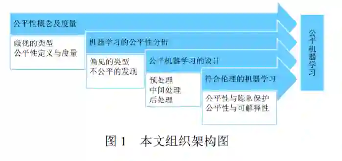 机器学习已经应用于许多领域,对人们工作与 生活产生了巨大影响,而其中的公平和偏见问题直 接影响着社会和公众对其信任程度,影响着人工智 能系统的应用部署,是机器学习技术研究与应用开 发所面临的新挑战。如何对公平性进行概念定义及 度量?如何发现机器学习应用中的不公平?如何 设计公平机器学习或者具有公平属性的机器学 习?如何实现具有隐私保护或可解释性等能力的 公平机器学习,并最终实现符合伦理的机器学习?鉴于此,为明确以上挑战的内涵并进行有效应对, 本文进行了介绍与讨论,对相关研究工作进行了系 统性调研与剖析,并对公平机器学习的未来研究及 值得关注的问题进行了展望。图 1 为本文的组织架 构图。