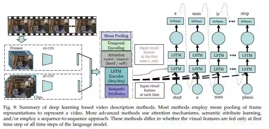 视频描述是自动生成描述给定视频内容的自然语言句子。它广泛适用于人类机器交互,帮助视力受损和视频标题生成。由于计算机视觉和自然语言处理的深度学习取得了前所未有的成功,过去几年来该领域的研究大量增加。研究文献中提出了许多方法,数据集和评估指标,呼吁需要进行全面调研综述,以将研究工作集中在这一蓬勃发展的新方向上。本文通过调研最先进的方法填补了这一空白,重点是深度学习模型;比较基准数据集的域,类别数和存储库大小;并确定各种评估指标的优缺点,如SPICE,CIDEr,ROUGE,BLEU,METEOR和WMD。经典的视频描述方法将主题,对象和动词检测与基于模板的语言模型相结合以生成句子。然而,大型数据集的发布表明,这些方法无法应对无约束开放域视频的多样性。经典方法之后是一个非常短暂的统计方法时代,很快被深度学习所取代,深度学习是视频描述的现有技术。我们的调研显示,尽管发展速度很快,但由于以下原因,视频描述研究仍处于起步阶段。对视频描述模型的分析具有挑战性,因为难以确定最终描述中视觉特征和所采用的语言模型对准确性或错误的贡献。现有数据集既不包含足够的视觉多样性也不包含语言结构的复杂性。最后,当前的评估指标未能衡量机器生成的描述与人类描述之间的一致性。我们通过列出有希望的未来研究方向来结束我们的调研。