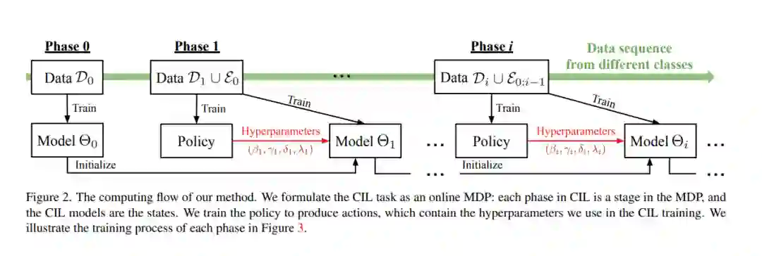 类增量学习(class incremental learning, CIL)旨在在类别数量逐步增加的情况下训练分类模型。CIL模型面临的一个内在挑战是稳定性与可塑性的权衡,即CIL模型既要保持稳定性以保留旧知识,又要保持可塑性以吸收新知识。然而,现有的CIL模型都不能在不同的数据接收设置中实现最佳权衡——通常,从一半开始训练(TFH)设置需要更大的稳定性,但从头开始训练(TFS)需要更大的可塑性**。设计了一种在线学习方法,可以在不知道先验设置的情况下自适应地优化权衡。**首先引入了影响权衡的关键超参数,例如知识蒸馏(KD)损失权重、学习率和分类器类型。然后,将超参数优化过程建模为一个在线马尔可夫决策过程(MDP)问题,并提出了一种具体的算法来求解该问题。本文采用局部估计奖励和经典bandit算法Exp3[4]来解决将在线MDP方法应用于CIL协议时存在的问题。所提出方法在TFH和TFS设置中不断改进表现最好的CIL方法,例如,与最先进的[23]相比,在ImageNet-Full上将TFH和TFS的平均精度提高了2.2个百分点。
