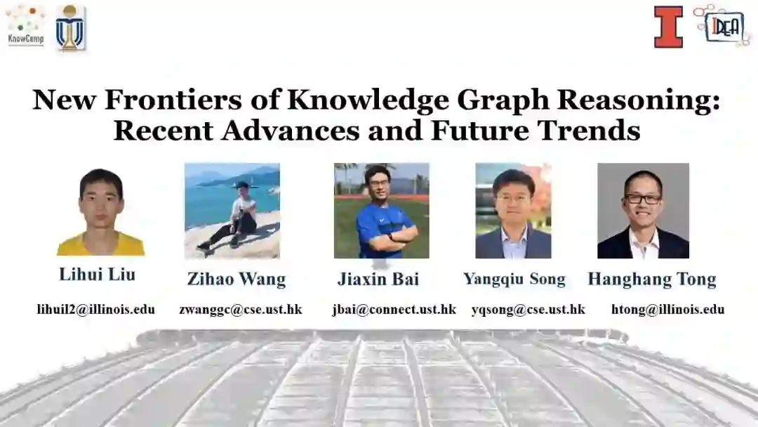 引言(20分钟,刘立辉) 我们将简要回顾背景知识、问题设置和该主题的主要挑战。我们还将介绍知识图谱推理的各种应用,例如问答系统 [10, 19, 21, 35]、事实核查 [11, 18, 23, 25] 和对话问答 [4, 14, 15, 22]。 • 第一部分:知识图谱推理:基本概念和技术(50分钟,童航航,刘立辉) 在这一部分中,我们将讨论知识图谱推理的基本概念和技术及其分类, – 知识图谱嵌入 [1, 6, 16, 38, 40, 44] – 基于规则的推理 [8, 9] – 基于路径的推理 [5, 28, 42] • 第二部分:最新进展一:不同查询类型的知识图谱推理(40分钟,童航航,刘立辉,王子浩,白佳鑫,宋杨秋) 在这一部分中,我们将讨论不同类型查询的知识图谱推理,包括 – 复杂图查询推理 [31, 32, 36] – 多跳查询推理 [17, 21] – 比较查询推理 [18] – 对话查询推理 [4, 15] • 第三部分:最新进展二:知识图谱的神经符号推理(30分钟,王子浩,白佳鑫,宋杨秋) 在这一部分中,我们将讨论使用知识图谱的神经符号推理,包括 – 神经软逻辑规则推理 [33, 45] – 神经规则挖掘 [3, 30, 34] – 神经子图推理 [12, 39] • 第四部分:最新进展三:知识图谱推理与大型语言模型的结合(30分钟,王子浩,刘立辉) 在这一部分中,我们将讨论知识图谱推理与大型语言模型(LLMs)之间的关系 – 知识图谱增强的LLMs训练 [26, 41] – LLMs辅助的知识图谱补全 [13, 46] – 知识图谱推理与LLMs的整合 [37, 47] • 第五部分:开放挑战与未来方向(10分钟,刘立辉) 在这一部分中,我们总结教程并介绍潜在的未来方向,例如多模态推荐、药物发现、常识知识图谱推理和开放世界知识图谱推理。