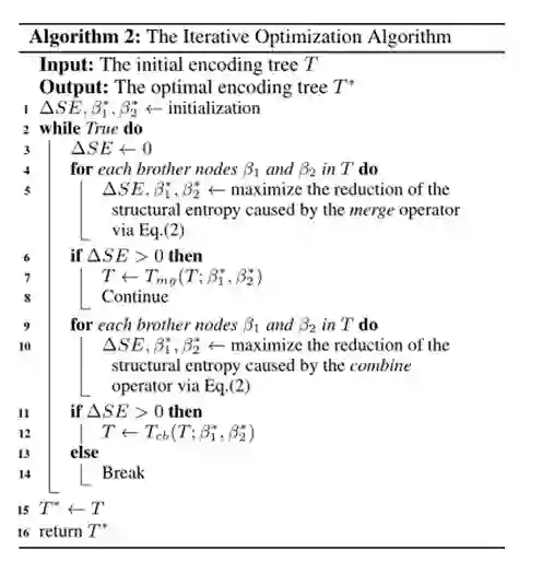 在结构信息原理中,结构熵在分层划分策略下动态测量复杂图的不确定性,并通过最小化结构熵,生成目标图的最优层次结构,即最优编码树。假设给定一个加权无向图G=(V,E,W),V是顶点集,E是边集,W是权重函数。设n=|V|为顶点数,m=|E|为边数。对于每个顶点v∈V,其度dv被定义为其连接边的权重之和。则加权无向图G的编码树、一维和K维结构熵的定义如下。``` 编码树: 图G的编码树是一个有根树,定义如下: 1)对于每个节点α∈T,G中存在一个顶点子集Tα对应于α,Tα⊆V。 2)对于根节点λ,设置Tλ=V。 3)对于每个节点α∈T,将其子节点标记为α∧⟨i⟩,随着i的增加从左到右排序,并且α∧-=α。 4) 对于每个节点α∈T,L假定为其子节点的数量;则所有顶点子集Tα∧⟨i⟩是不相交的,并且Tα=ULi=1Tα∧。 5) 对于每一个叶节点v,Tv是一个包含图顶点的单例子集。