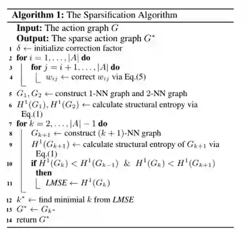 为了降低整个过程的计算成本并消除完全图中无效动作关系的负面干扰,需要对动作图进行稀疏化,最小化完全图的一维结构熵,将其转化为k最近邻图,即对于每个动作仅选择与其功能性相似度最高的k个动作进行保留,作为其邻居图节点,具体过程如算法1所示。