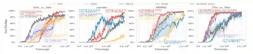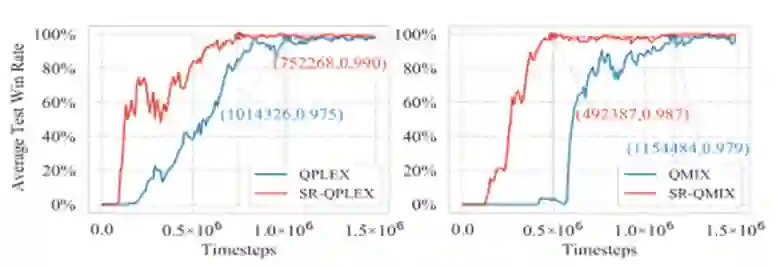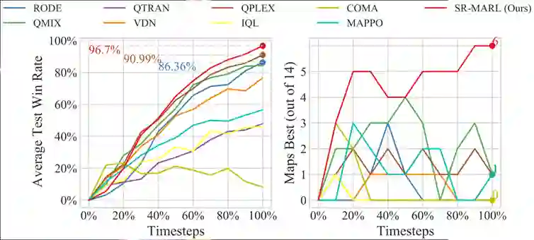 为了使实验对比结果更具说服力,我们将SR-MARL与最先进的MARL算法进行了比较,包括QMIX、QPLEX、QTRAN、RODE等。