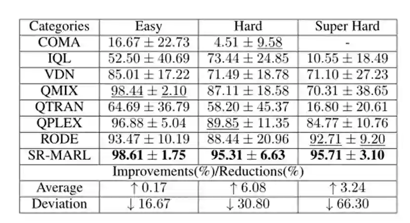 在星际争霸II(SMAC)基准上评估了SR-MARL,包括五个简单地图、四个困难地图和五个超困难地图,其中困难地图和超困难地图通常是需要智能体学习复杂协作策略的探索任务