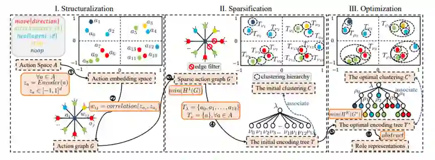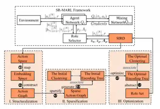 SIRD包括结构化、稀疏化和优化等模块。在结构化中,动作空间被映射到一个固定维度的嵌入空间,并基于动作功能相关性构造一个完全动作图。在稀疏化中,对动作图进行稀疏化,并生成稀疏图的初始编码树。在优化中,对编码树进行优化,以发现联合动作空间的层次化结构,即最优编码树,并在最优编码树上定义抽象函数以实现角色发现。