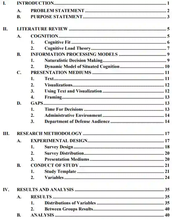 有必要通过呈现媒介报告信息,以促进国防部门环境下的准确决策。国防部门内的各种报告通常包含大量使用序数尺度描述作战情况或特定情境的变量(例如车辆维修)。例如,将舰艇润滑油状况描述为“重要”。存在指向各种物理属性(如污染物和零部件磨损)的变量子集。该变量子集共同达到“重要”阈值。然而,最终报告分类仅以“重要”文本形式提供给读者(参见附录)。变量的内在模糊性可能减慢决策过程或导致混淆,从而引发不准确决策。因此,需要研究探索由呈现媒介导致的决策准确性表现差异。个体的背景能力和报告的框架设计是测试呈现媒介对决策准确性差异时需要控制的重要变量。国防部门绩效报告通常在最终评估中包含高阶变量,这些变量会影响后续反应。对这些报告的必要反应往往取决于报告的措辞和决策者对结果概率的空间理解能力。此前一篇海军论文研究了类似主题,重点关注海军晋升委员会中多变量可视化的使用,但该研究以人力信息为重点。鉴于国防部门信息密集的环境,有必要理解从报告到决策者之间不同信息传递媒介的动态/效应,以协助他们做出准确选择。