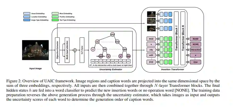 人们普遍认为,一个词的标题的不确定性越高,就需要更多相互关联的上下文信息来确定它。然而,目前的图像描述生成方法通常考虑顺序、平等地生成句子中的所有单词。在本文中,我们提出了一个不确定性感知的图像描述成框架,该框架并行迭代地在已有词之间从易到难插入不连续候选词,直到收敛。我们假设句子中的高不确定性词需要更多的先验信息才能做出正确的决定,应该在后面的阶段产生。由此产生的非自回归层次结构使得标题生成可解释且直观。具体来说,我们利用图像条件下的单词袋模型来测量单词的不确定度,并应用动态规划算法来构造训练对。在推理过程中,我们设计了一种不确定性自适应并行波束搜索技术,它产生了一个经验对数时间复杂度。在MS COCO基准上的大量实验表明,我们的方法在描述质量和解码速度上都优于强基准和相关方法。