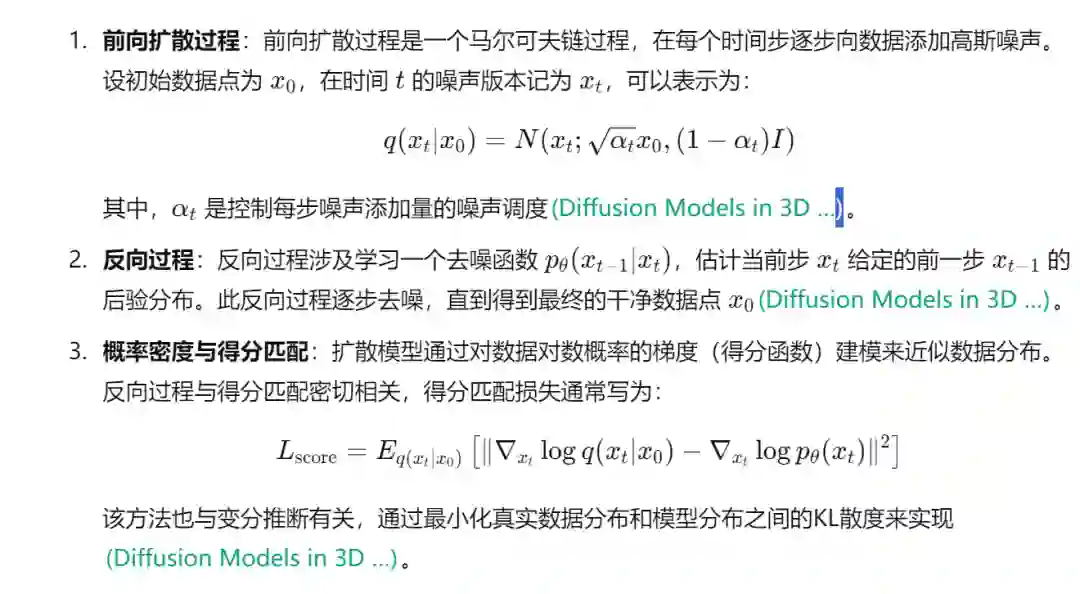 C. 扩散模型的变体 1. 去噪扩散概率模型(DDPMs):在DDPM中,前向过程逐步将高斯噪声添加到数据中,使原始数据分布转变为已知先验(通常为标准高斯分布)。反向过程则由神经网络参数化,并训练为逐步去噪。DDPM通过优化变分下界,实现高保真度图像生成(Diffusion Models in 3D …)。 1. 基于得分的生成模型(Score-Based Generative Models):这种变体使用得分匹配技术,以更直接地估计数据分布的梯度(Diffusion Models in 3D …)。 1. 随机微分方程(SDE):此类扩散模型的连续时间公式使其在三维生成任务中更具灵活性,例如生成点云和体素网格(Diffusion Models in 3D …)。 D. 三维视觉中的生成过程 与生成对抗网络(GANs)和变分自编码器(VAEs)相比,扩散模型在三维视觉任务中具有更强的生成能力,能够生成光滑的连续表面,并处理复杂的高维数据。这对于需要详细几何结构的应用(如三维形状重建)特别有利。