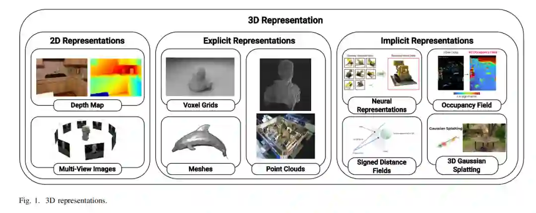 点云:点云通过三维坐标表示物体或场景的形状。其主要优势在于对几何数据的直接捕获。然而,由于缺乏拓扑信息,点云通常需要进一步处理,以实现渲染或仿真。 1. 隐式表示 隐式表示通过数学函数定义三维几何,例如有符号距离场(SDF)和占用场。它们通常用于生成平滑、连续的表面,并能处理复杂的几何形状。