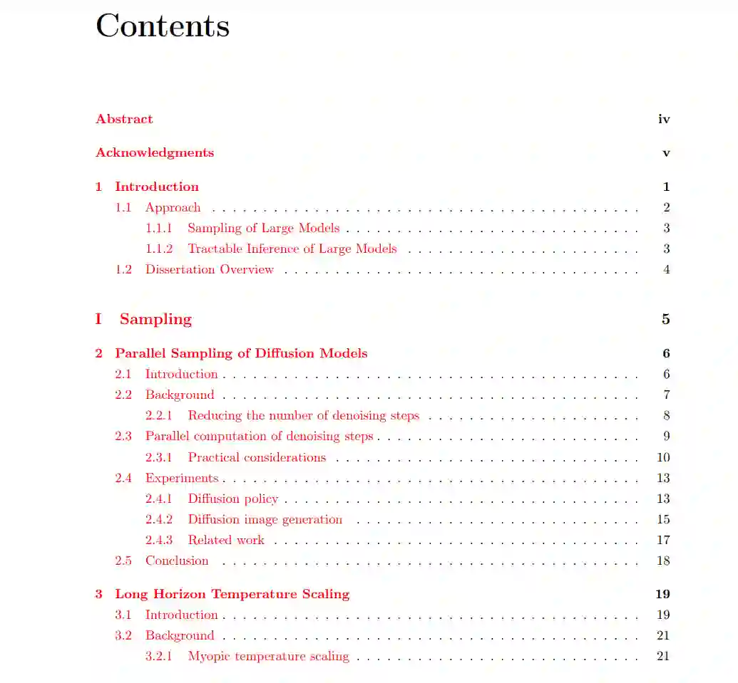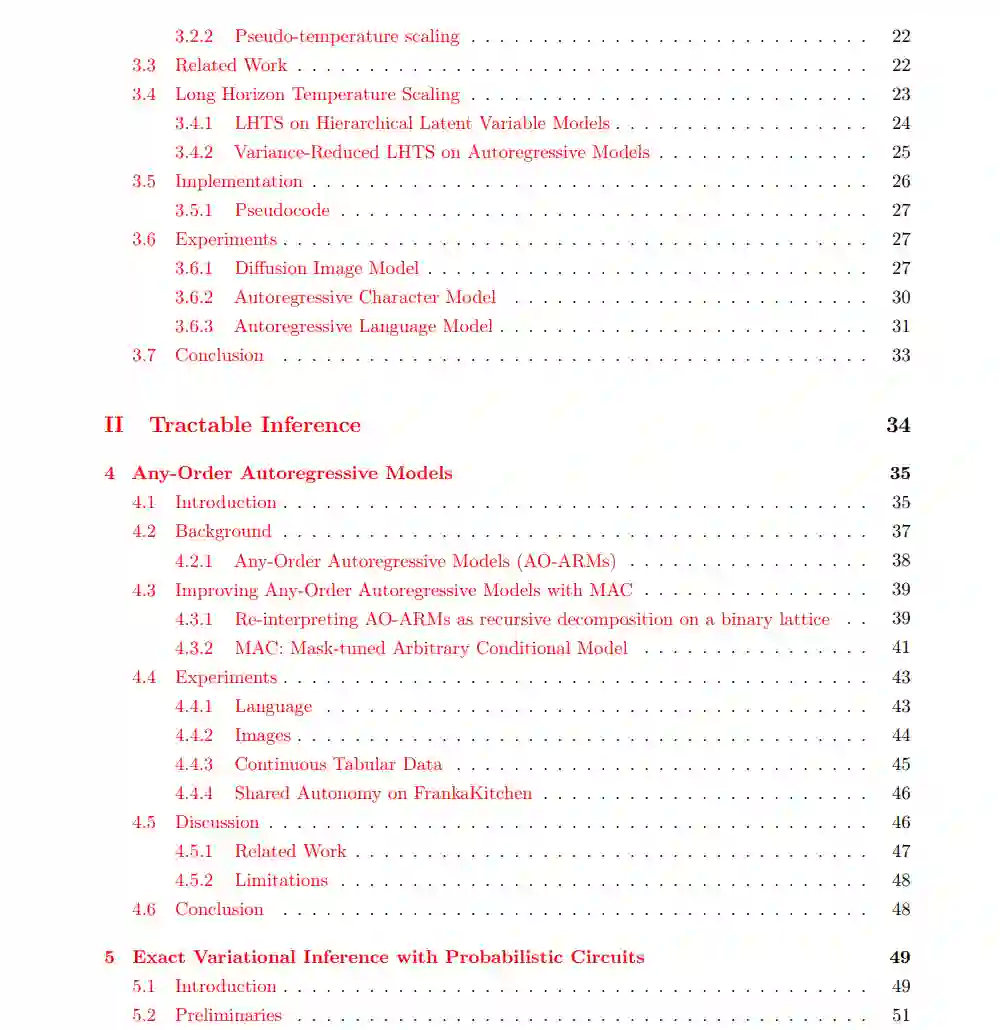我们将论文组织为两部分,共享同一个总体目标:1) 大型模型的采样,以及2) 大型模型的可行推理。在第一部分,我们研究了预训练模型的采样,特别是改进了从扩散和自回归模型的底层概率分布中抽取样本的技术。在第二部分,我们将注意力转向可行的推理,这涉及估计生成模型的不同量(如期望值、条件似然)的问题。我们展示了改进的架构和算法,以提高任意顺序自回归模型(AO-ARMs)和各种图形模型上的可行推理效果。