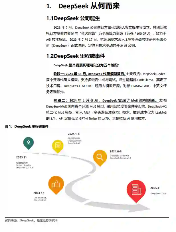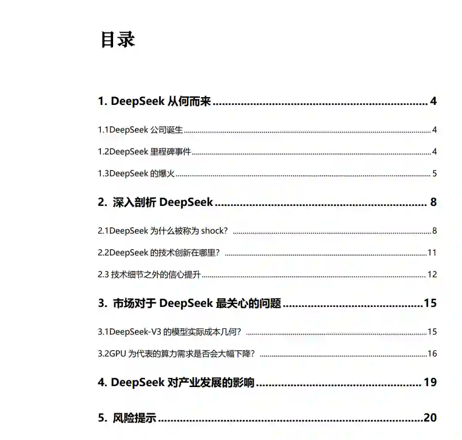 2025年1月20日,DeepSeek发布自研模型R1在全球科技行业引起的震动,被西方媒体称为“DeepSeekShock”。DeepSeek不仅在媒体圈迅速爆火,同样也成为了资本市场的宠儿,其概念指数仅仅诞生10日后板块成交金额就超过了全部A股成交额的20%。这一切现象究其原因,是因为DeepSeek通过技术微创新,以更低的硬件成本和更短的时间实现了可以与市场领先产品竞争的能力。更重要的是,DeepSeek打破了行业“限制中国企业对于最先进GPU获取,将能够阻止中国AI技术发展”的一贯认知。 本文有别于市场上大部分研究报告冗长的技术细节描述,我们针对投资人短时间内客观理解DeepSeek的需求,加入了不同于市场的思考和量化的分析比较。以下是报告的核心观点: DeepSeek的技术创新在哪里?1)首创DeepSeekMoE架构,专门设计用于实现终极专家专业化。DeepSeekMoE通过降低激活参数比例,实现了训练效率3.6X的提升和训练吞吐量3.6X的提升。2)通过引入MLA机制,DeepSeek-V2实现了显著增强的性能,节省了42.5%的训练成本、减少了93.3%的KV缓存、并将最大生成吞吐量提升至5.76倍。 DeepSeek-V3实际开发成本几何?公司官宣正式训练成本为580万美元,但是并没有披露隐性成本。DeepSeek-V3是建立在前期模型基础上开发的,前期研发投入约为2000-3000万美元。其他数据获取成本和硬件折旧成本未披露,实验试错成本约为500万美元,因此预计实际总成本超过4000万美元。实际成本虽然高达公开口径成本的7倍左右,但是仍然相对Llama3-405B降低了约69%;相对于GPT-4o降低了95%。 未来GPU算力需求会大幅下降吗?短期内云服务大厂资本开支持续处于上升通道,这是由于ScalingLaw导致行业对于算力军备竞赛的恐慌性投资仍然存在。但是ScalingLaw中,数据资源同样限制着模型性能的提升。根据EPOCHAI预测,到2028年人类生成的公共文本数据总有效库存量约为300Ttoken将被全部耗尽。换句话说,在现有模型框架和数据资源供给下,2028年之后单纯算力提升将难以继续推动模型性能的升级。 核心结论: 给予行业“强于大市”评级。随着DeepSeek的横空出世,低成本高性能的模型训练部署成为可能。我们预计接入DeepSeekAPI的细分领域推理服务商将会快速涌现,同时终端设备将会能够实现蒸馏小模型的本地部署能力,包括服务器,智能手机和智能驾驶系统都将会迎来新一轮的升级浪潮。我们看好以下细分板块在DeepSeek推动下的未来发展: 先进算力芯片制造产业链:算力芯片设计,先进制程晶圆代工,先进封测等等。 专业咨询服务:包括AI+医疗,法律,金融,会计,教育,政务等咨询服务领域。 2C智能终端:AI+智能手机,智驾汽车等终端产业链。 2B本地部署设备:服务器OEM及产业链。