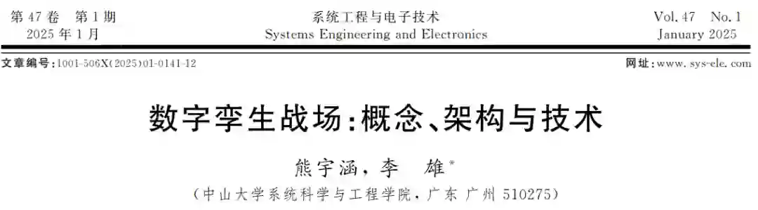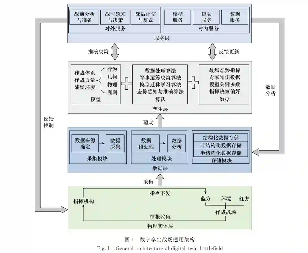 摘 要:当前作战仿真模型存在态势理解滞后、物理模型无法更新等问题,这些问题将影响后续态势推演与 决策效果。为此,提出数字孪生战场的概念,并建立数字孪生战场的4层架构模型。基于这种模型,分析其在战 场空间的部署方式及寿命周期运用,探讨其潜在运用价值。同时,从多源数据采集与处理、孪生战场建模、模型动 态更新和态势推演与决策4个视角出发,讨论数字孪生战场建模所需的关键技术。随着作战仿真模型的运用,可 以帮助指挥机构做出更高效的决策。 关键词:数字孪生战场;指挥决策;多源数据采集;作战建模;模型更新;态势推演 0 引 言 随着计算机技术的发展,在现代战争中,人工智能、物 联网、大数据等新型技术与指挥作战紧密结合。如今,随着 分布式作战、多域联合作战等新型作战概念提出与运 用[12],作战单元之间和作战区域之间的联动愈发频繁。通 过决策推演算法,指挥机构能够在战场后方对各方作战情 况进行态势判别与推演,生成并下发指挥决策指令[3]。但 在针对全局作战的指挥决策过程中仍有如下问题:(1)现代战争持续时间长,作战范围广泛,位于战场后 方的指挥机构很难在短时间内接收并同时处理多源的传感 器信息。这种限制将使得指挥机构对全局态势的理解有滞 后性与不可靠性,对后续的推演分析和指挥决策造成影响。(2)现代战争是一个复杂系统,战场的轻微扰动可能 会对战场走势造成巨大影响。传统的作战推演模型多为离 线仿真模型,不能对模型关键参数进行实时更新,缺乏针对 性与适应性。这种限制也将对最终的决策产生不利影响。因此,需要开发一种掌握全局资源要素,实时接收战场 信息的全域作战仿真模型。此模型需要在复杂情况下适应 战争突发性与多变性,统筹全局信息,并内嵌推演与决策算 法,以实现战场态势的实时仿真推演,为指挥机构提供可靠 的作战决策方案。数字孪生技术作为一种在线仿真技术,可以实时检测物理实体的状态信息,将多领域信息融合,在 数字空间中同步进行多学科仿真。如今,这项技术已在生 产制造[47]、电力电工[810]、应急指挥[1112]等民生领域中进 行广泛研究,并逐步投入实际运用。运用数字孪生技术,从 战前分析与准备、战时感知与决策、战后评估与复盘3个方 面着手,对真实战场进行多尺度建模,与多种智能算法相结 合,可以建立全领域、多维度的寿命周期战场模型,完成战 场与数字空间的实时映射。这种数字模型能够较好地解决 现存推演模型中仿真效果弱、决策推演差的问题,实现实 时、准确且全面的战场态势感知,能够做出高质量决策指 令,充分发挥作战单元之间的协同作战潜力,有助于指挥机 构更好地统筹战场全局。 本文提出数字孪生战场模型的定义,探讨其设计架构、 空间部署与寿命周期运用,并对数字孪生战场构建的关键 技术进行研究。文章具体结构如下:第1节描述数字孪生 技术概念以及在军事领域运用现状;第2节描述数字孪生 战场的定义与架构,给出在时间层面与空间层面的具体运 用;第3节描述建立数字孪生战场的关键技术;最后进行总 结与未来展望。
